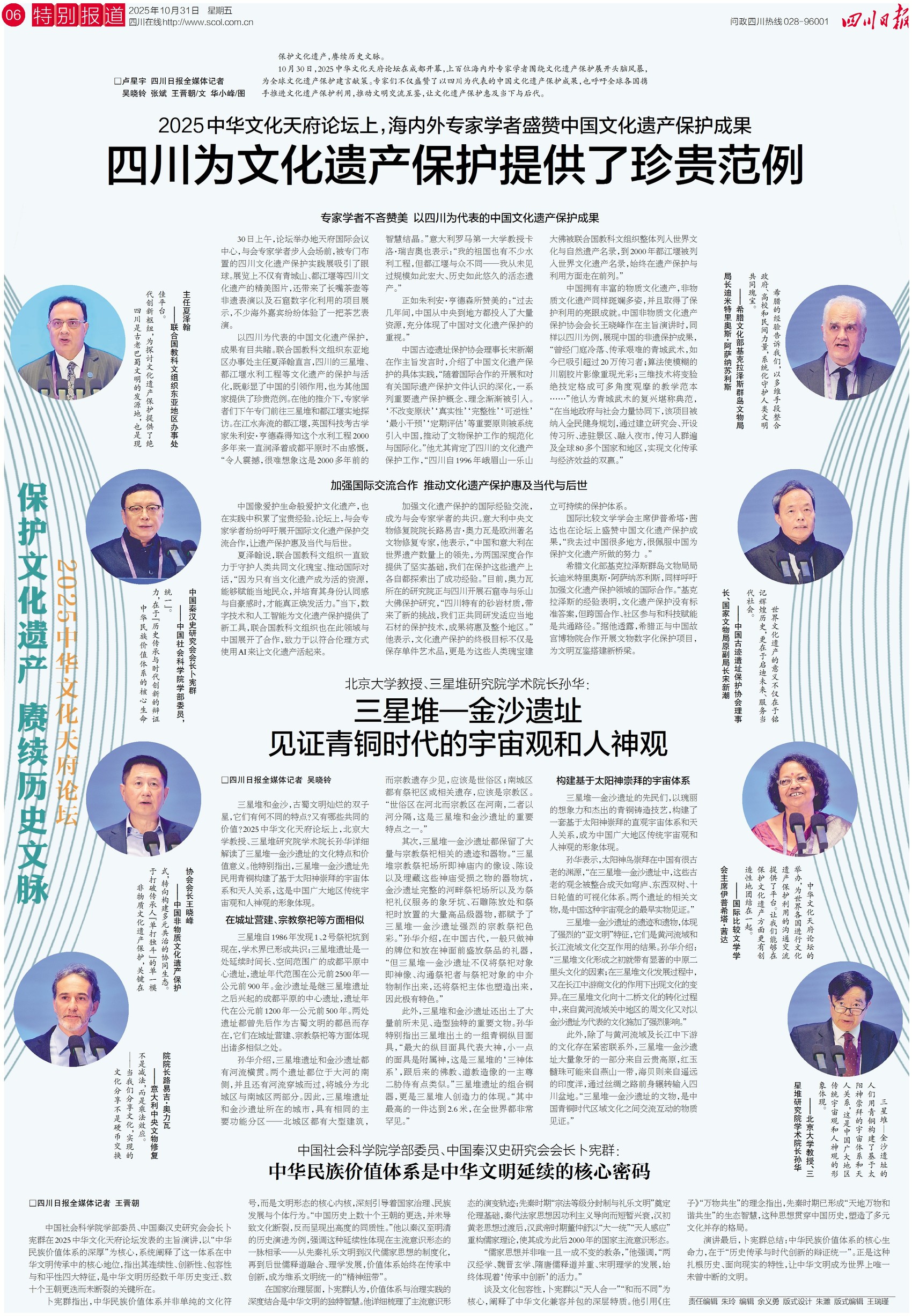 昨日,2025中华文化天府论坛在成都开幕。上百位海内外专家学者围绕文化遗产保护展开头脑风暴,为全球文化遗产保护建言献策。会上,专家学者盛赞四川为文化遗产保护提供了珍贵范例。今日六版,共享文化盛宴。