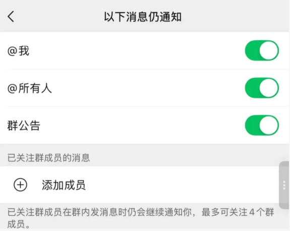 现在,微信群消息免打扰后也能选择性接收重要通知。点击“群聊右上角—以下消息仍通知”,可勾选“ @我、@所有人、群公告”还能添加4位重要群成员,收到他们的消息提醒。