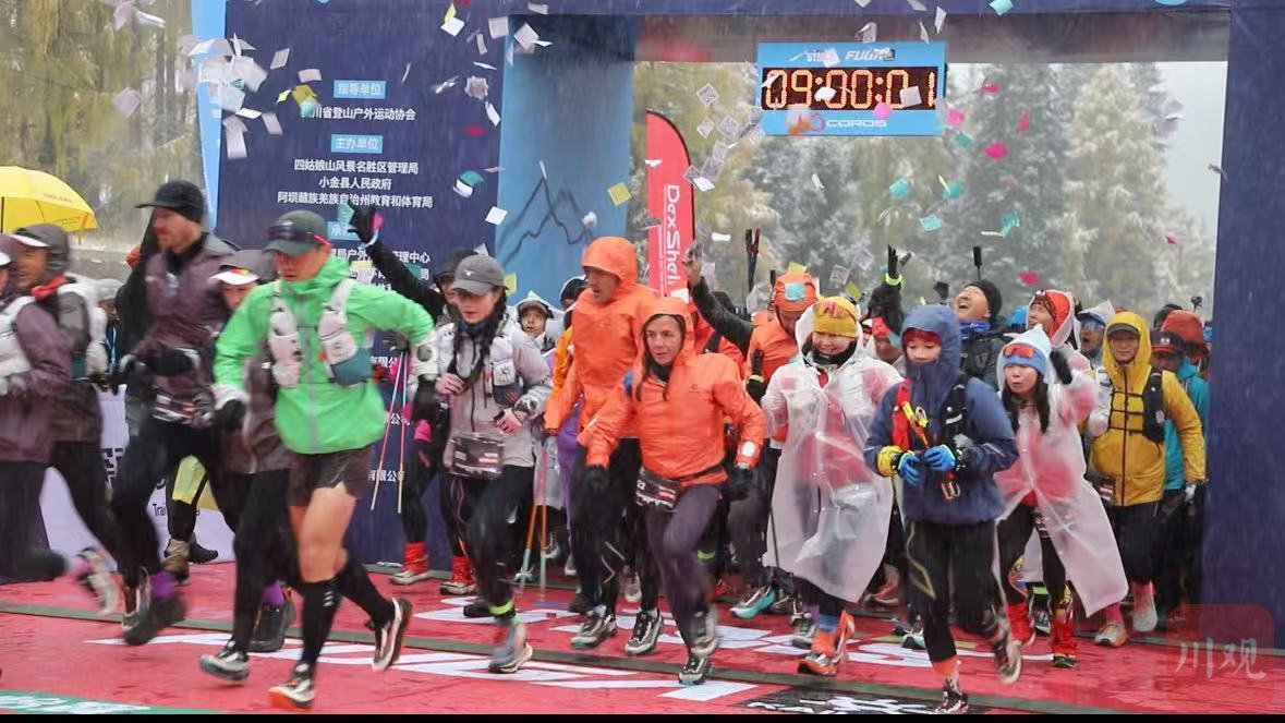 10月31日9时,四川省阿坝州小金县四姑娘山景区半山彩林半山雪,在红杉林景点,2025环四姑娘山超级越野跑(UTMS)100公里组别比赛鸣笛开跑,拉开本届赛事最长赛道的角逐。据了解,本届赛事共设置100公里、75公里、50公里、45公里、35公里5个组别,吸引2470名国内外选手报名参赛,赛事将持续至11月2日。