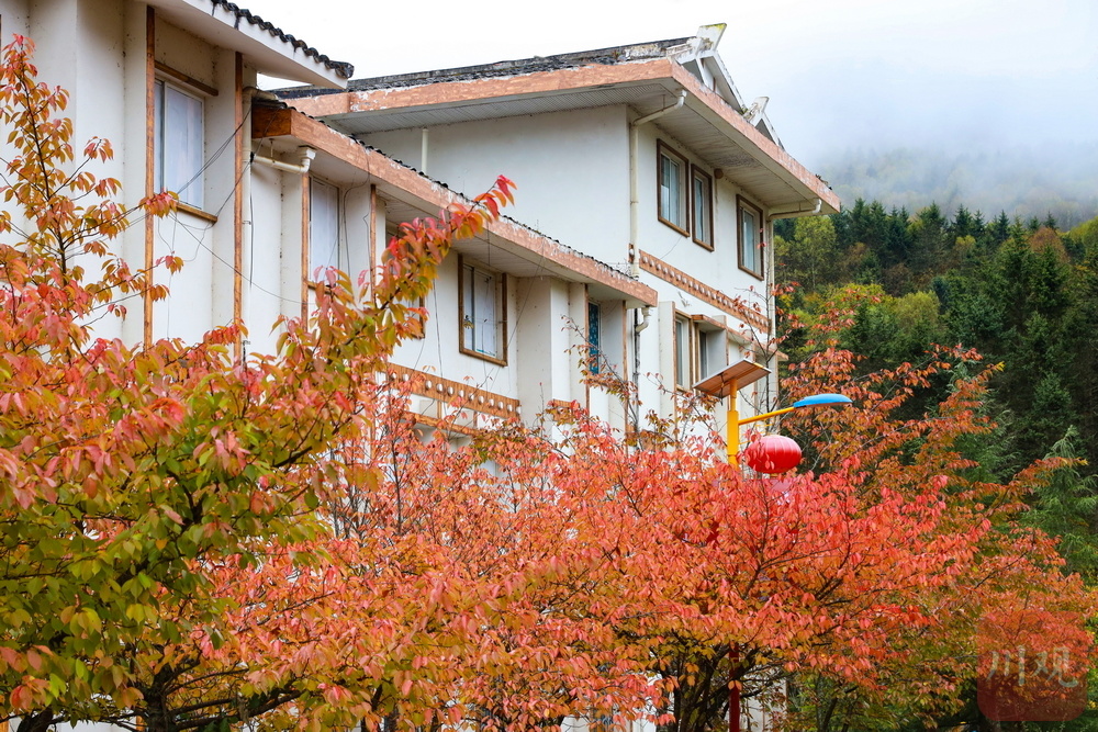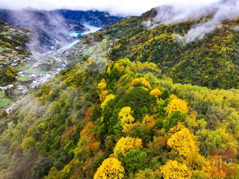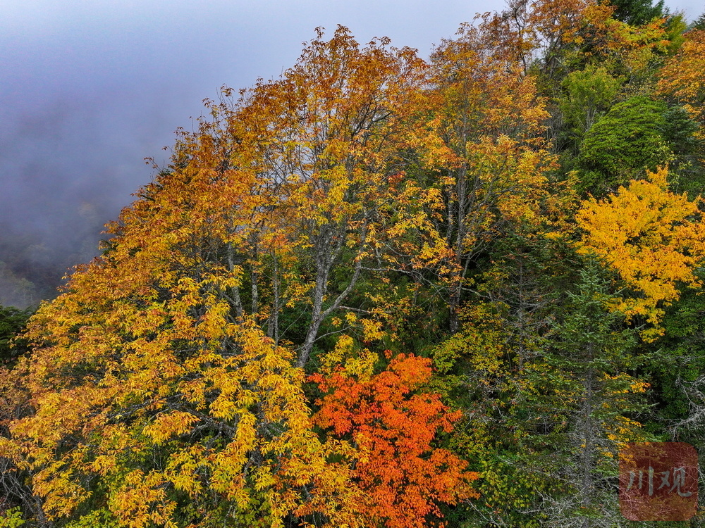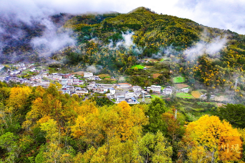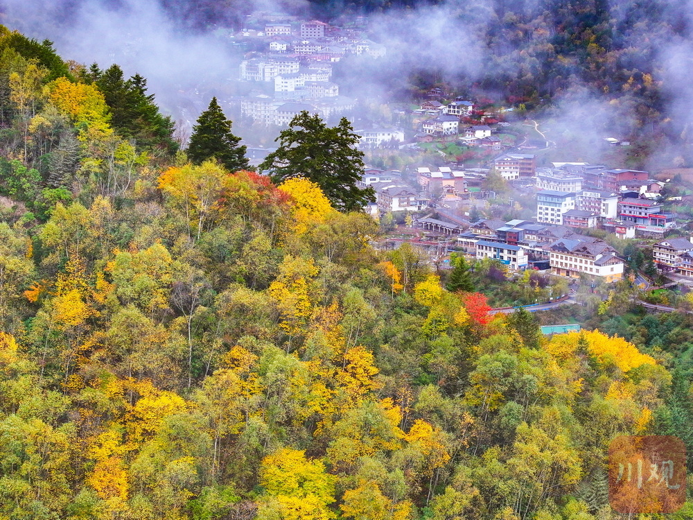 10月31日,走进雅安市宝兴县硗碛藏族乡,一望无际的山林披上了彩色“秋衣”,与山谷间的晨雾交融在一起,犹如一幅浓墨重彩的巨幅油画,正是一年中最绚丽的季节。