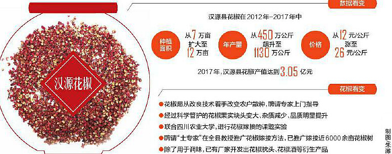 2017年,汉源县花椒产值达到3.05亿元。“五年来,汉源花椒的产量和价格都翻了番,我们花椒局,也扩充队伍,现在有五个人了。”胡文笑言。