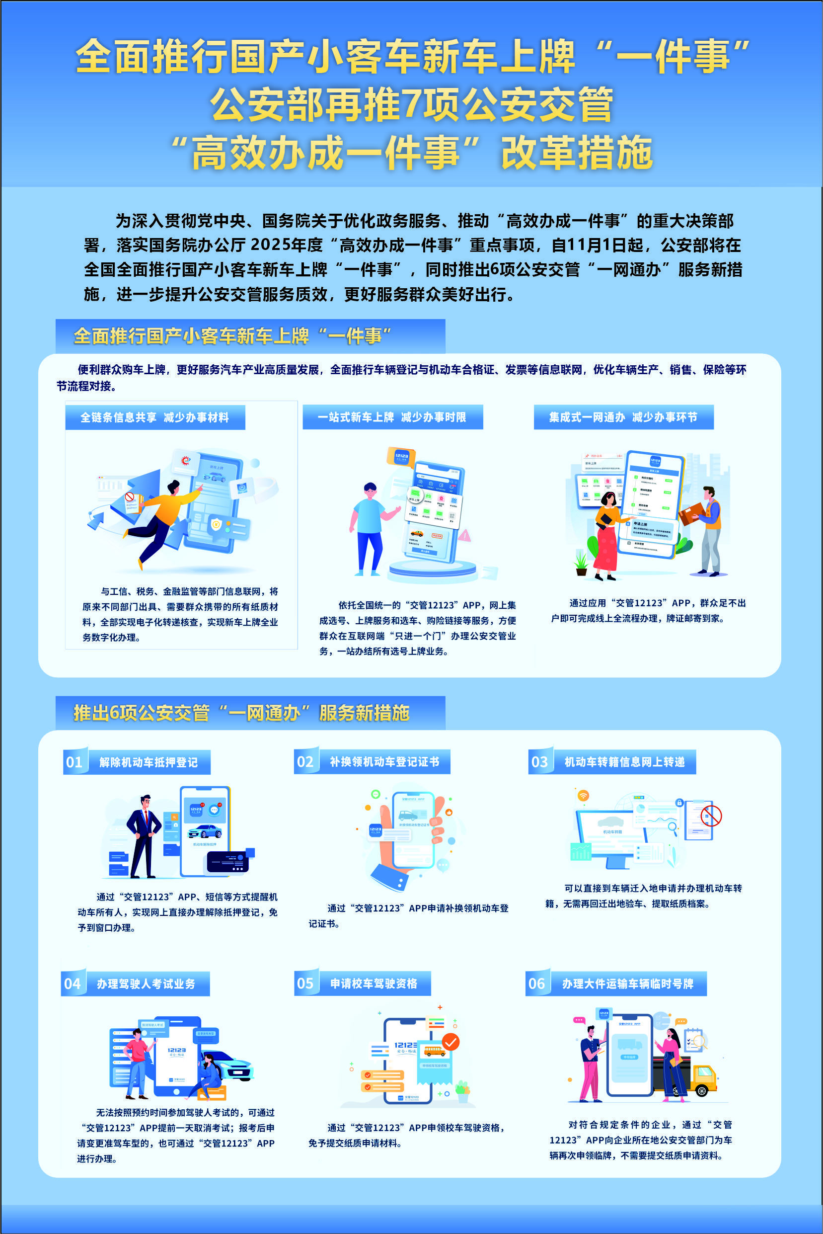 11月1日起,7项公安交管“高效办成一件事”改革措施正式实施,涵盖国产小客车新车上牌“一件事”以及6项公安交管“一网通办”服务新措施。