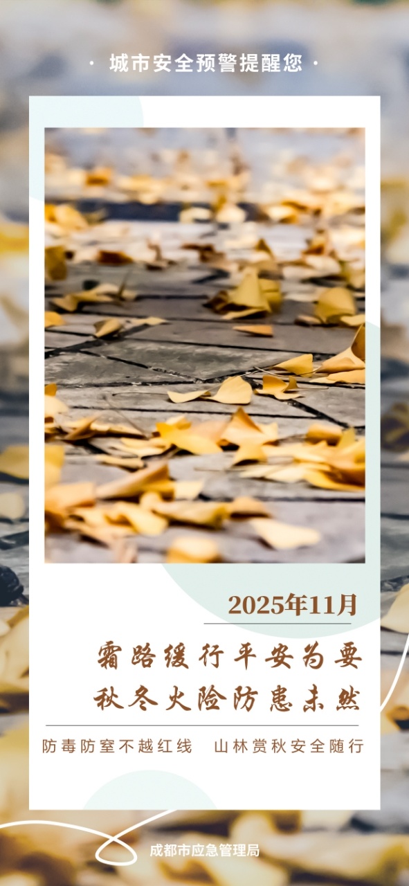 11月,进入秋冬转换时节,成都市易出现雨雾、霜冻等天气,可能对道路交通、城乡火灾、生产经营建设等方面造成不利影响。