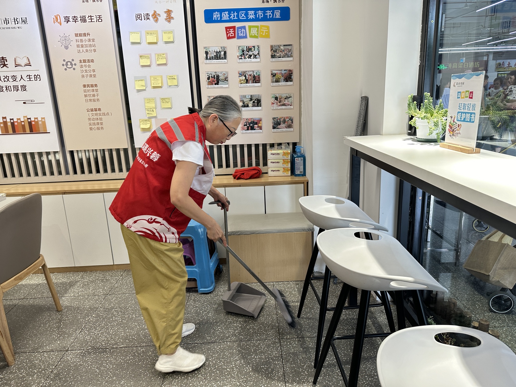 2024年1月,府盛社区菜市书屋成立,刘晓俊就成为书屋里的第一批志愿者,为前来阅读学习的居民们提供服务。当时正值冬天,空气里都是寒意。为了让农贸市场的摊主和商户的孩子们能在温暖的菜市书屋里阅读、休息,每个值班的清晨,刘晓俊都会风雨无阻地早早前往菜市书屋。“冷得不行,那个风围巾都挡不住,就像细密的针一样,从缝隙往脖子里钻。就是感受了那种冷,我当时就更觉得,我必须早点去,点亮书屋的灯。”刘晓俊回忆道。