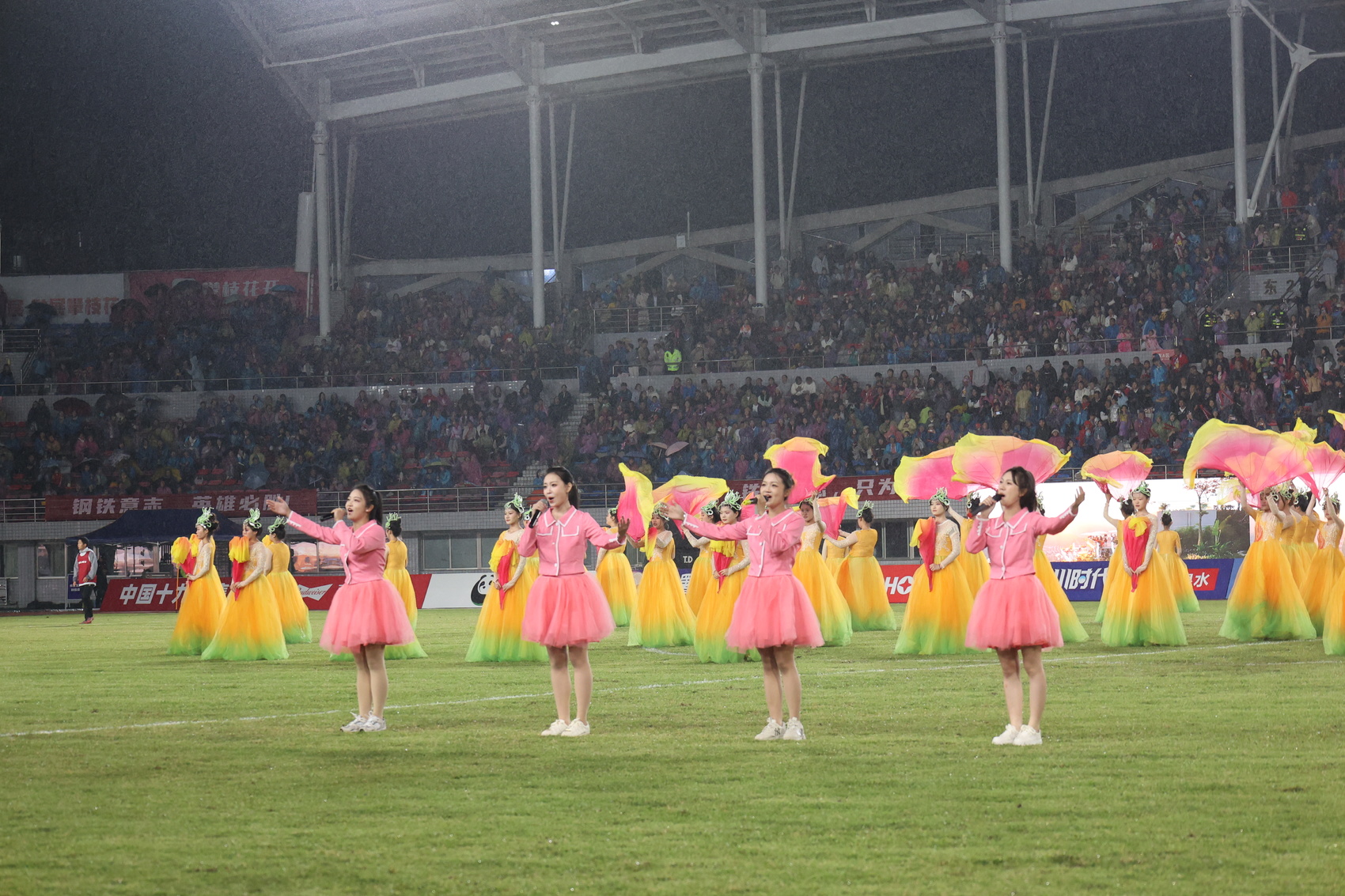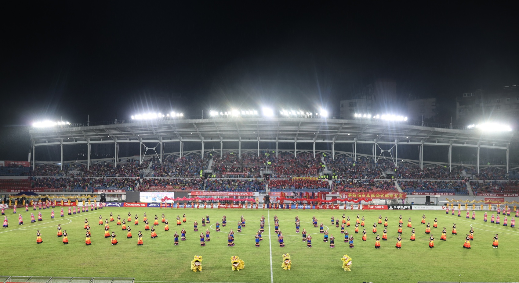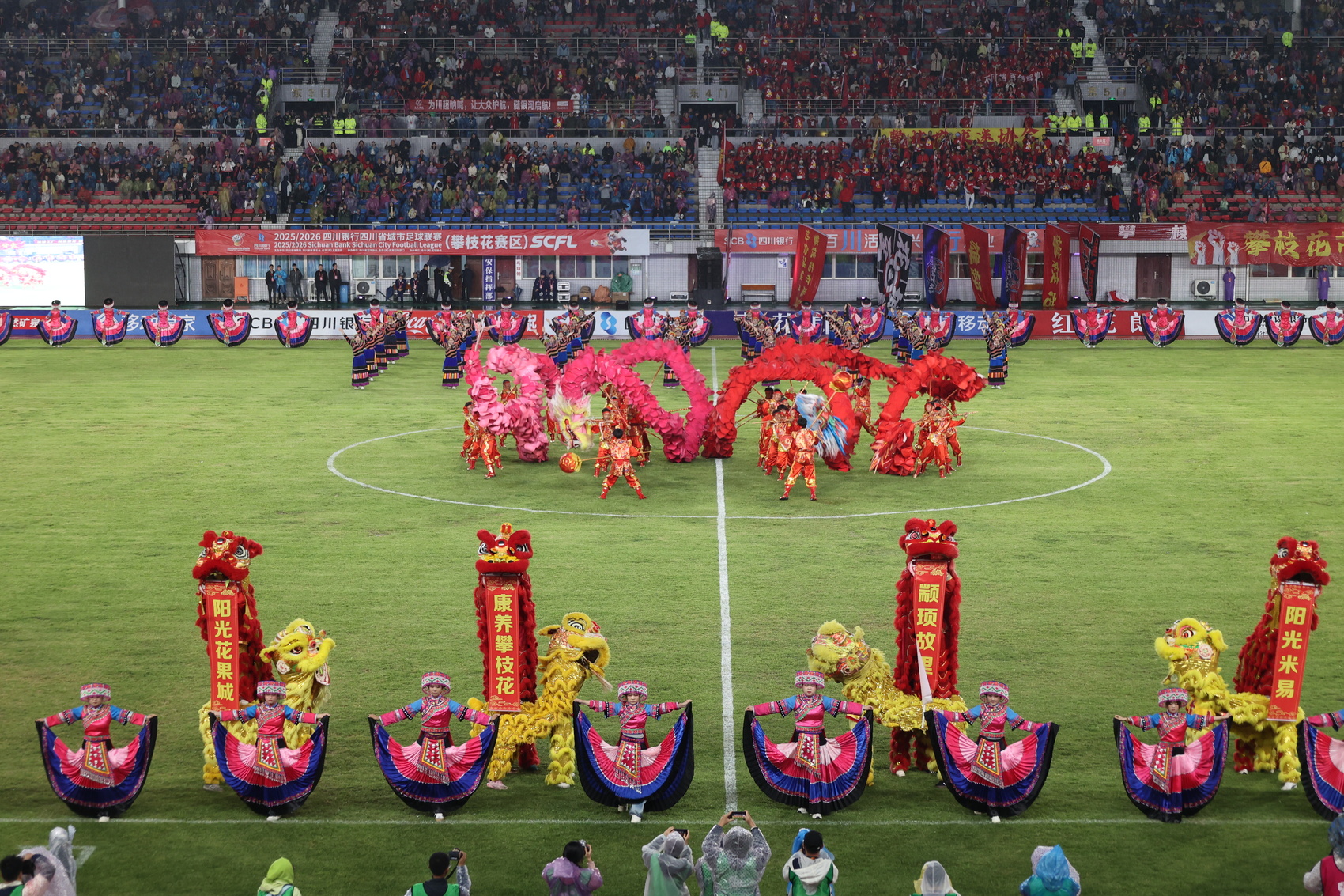 11月2日,攀枝花市体育场,细雨中的川超联赛(川西赛区)别具韵味。攀枝花攀钢钢铁勇士队主场迎战乐山味道非常队的绿茵对决之外,米易县近千人规模的文化展演同步登场,以非遗民俗碰撞足球激情,为观众献上一场沉浸式“体育+文化”的视听盛宴。