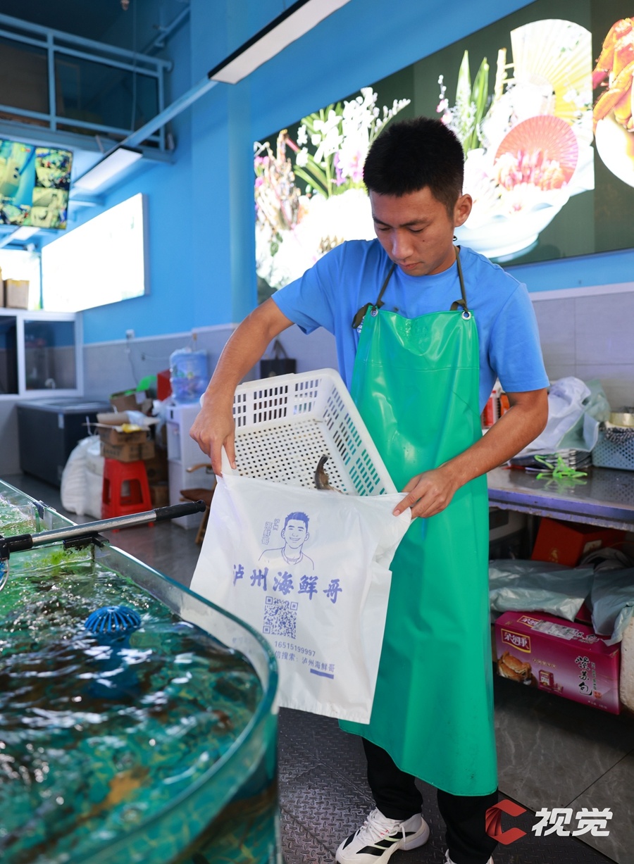 10月26日,泸州窖香队球员郭庆在泸州市江阳区的海鲜门市打包外卖海鲜。