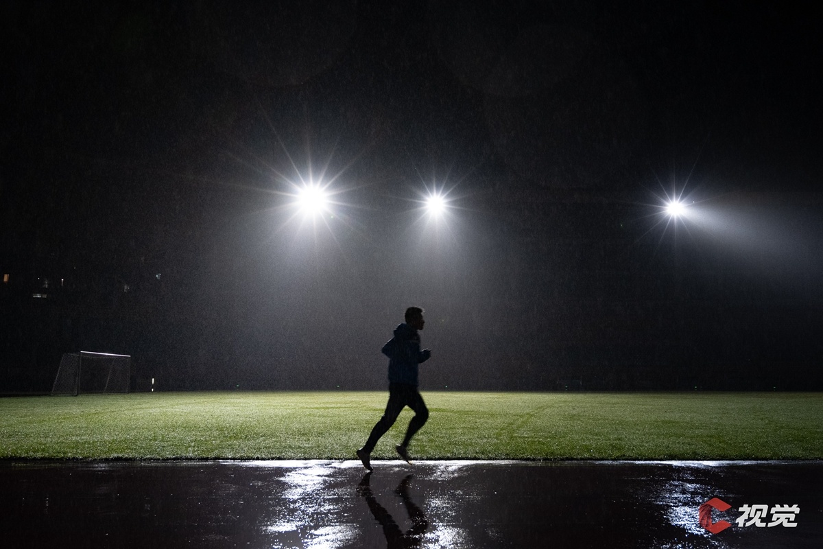 10月23日晚,38岁的雅安貊貊队守门员邹景安在足球训练结束后,加练跑步以提升体能。