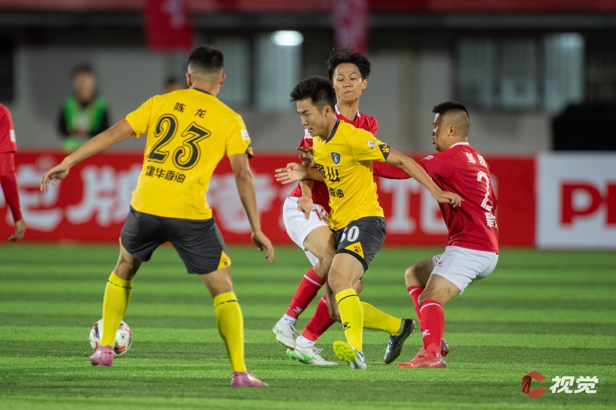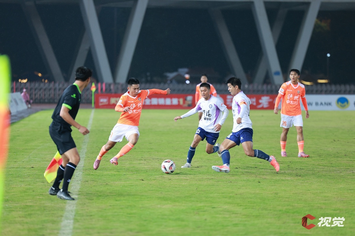 11月1日,郭庆(左二)在“川超”比赛中突破。当晚,泸州窖香队以2∶0战胜对手。