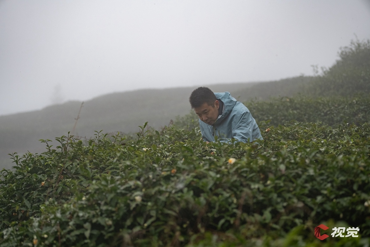 10月23日,邹景安在雅安蒙顶山附近的茶园查看茶树长势。