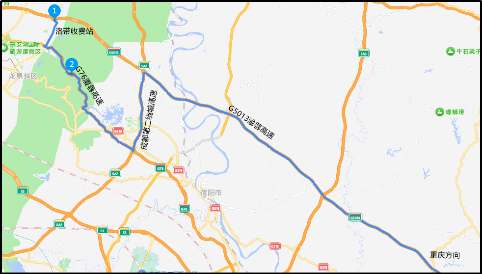 原需从洛带收费站进站前往重庆方向的车辆,经阳光大道绕行至G76厦蓉高速公路成都收费站进站,通过SA2成都第二绕城高速公路转换进入G5013渝蓉高速公路继续行驶。