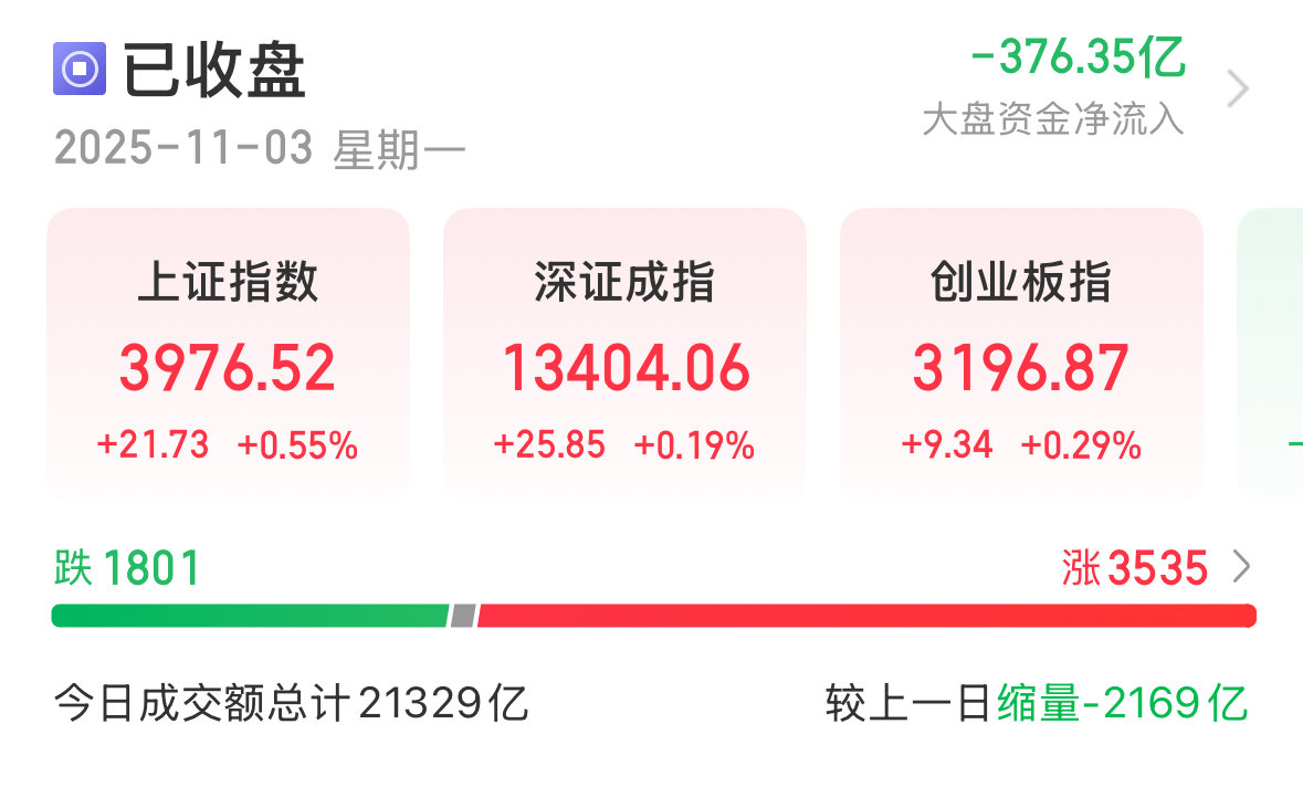 11月3日,A股三大指数小幅收涨,截至收盘,上证指数涨0.55%,收报3976.52点;深成指涨0.19%,收报13404.06点;创业板指涨0.29%,收报3196.87点。全市场全天成交额21329亿元,较上日缩量2169亿元。全市场超3500只个股上涨。