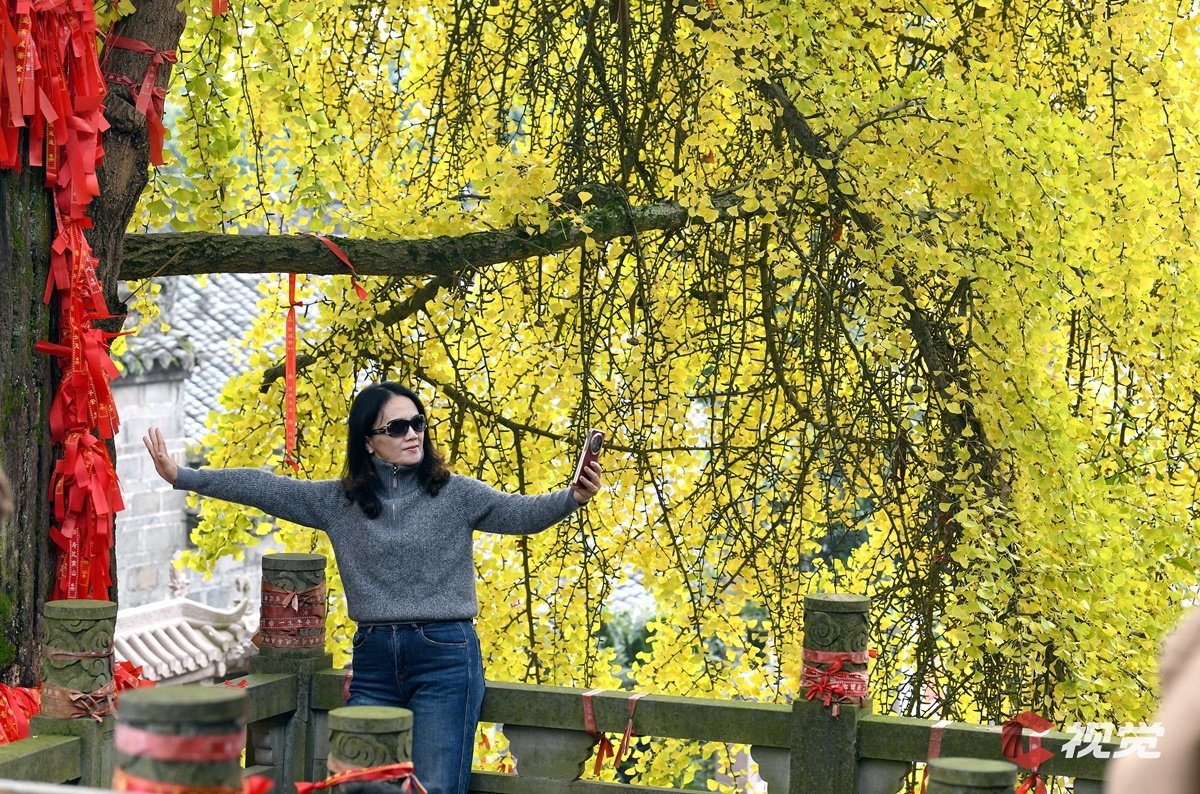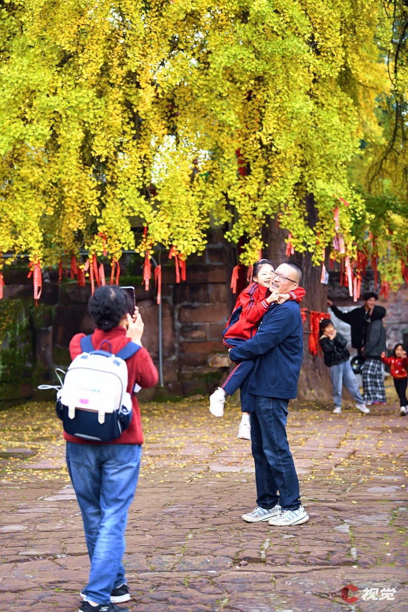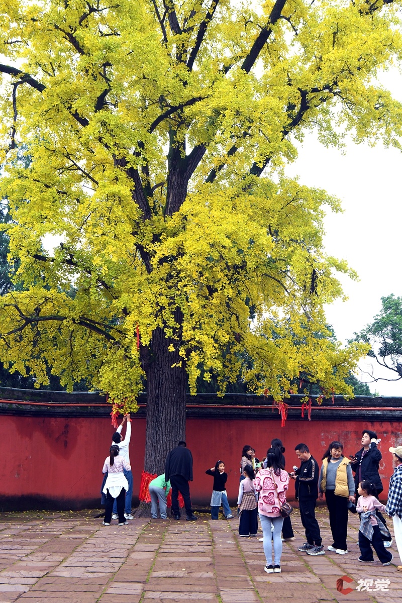 11月2日,金堂县云顶山慈云寺内,成都地区最早“呈”黄的千年银杏“夫妻树”进入观赏期,吸引不少市民游客前来观光打卡。