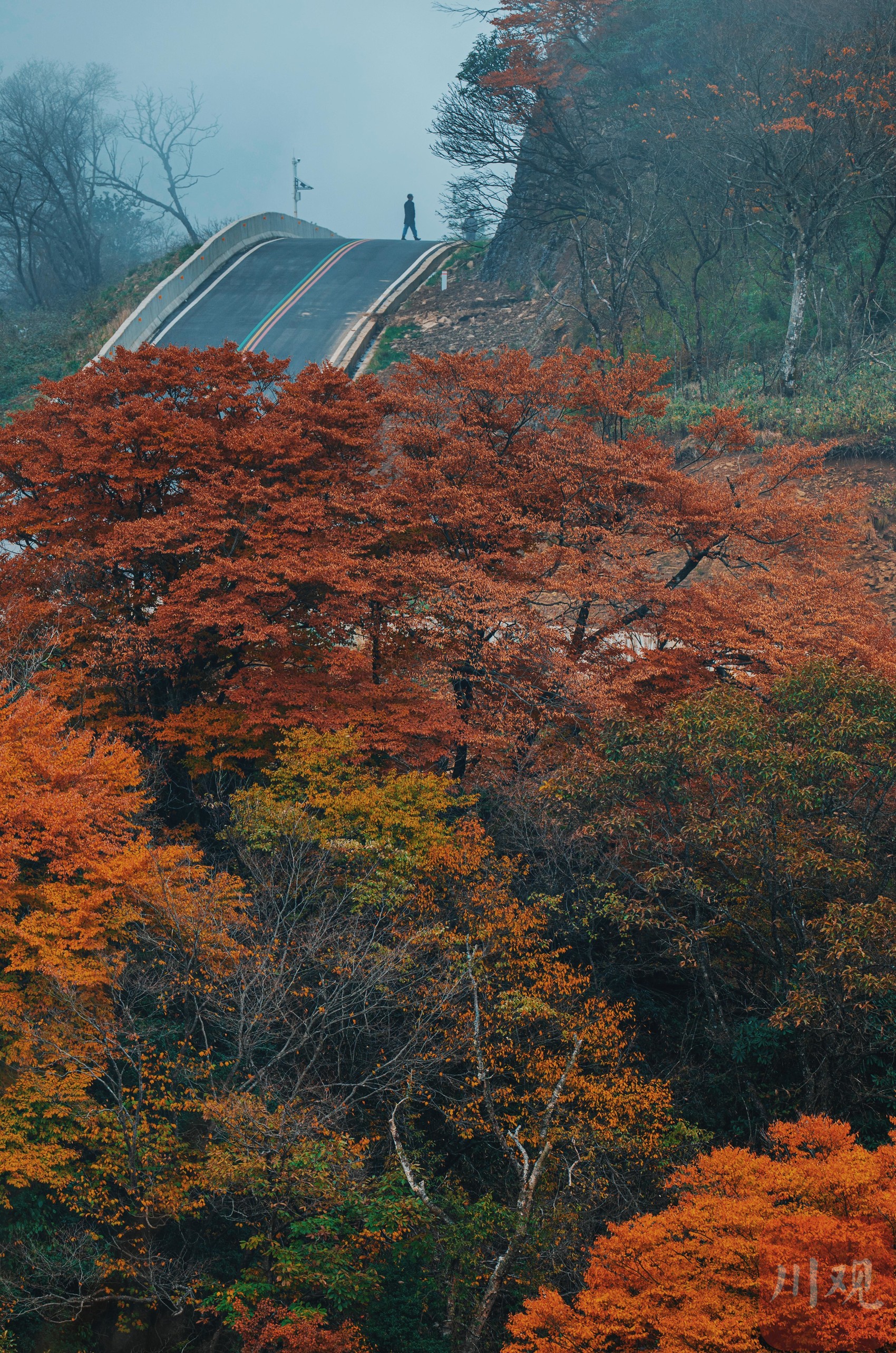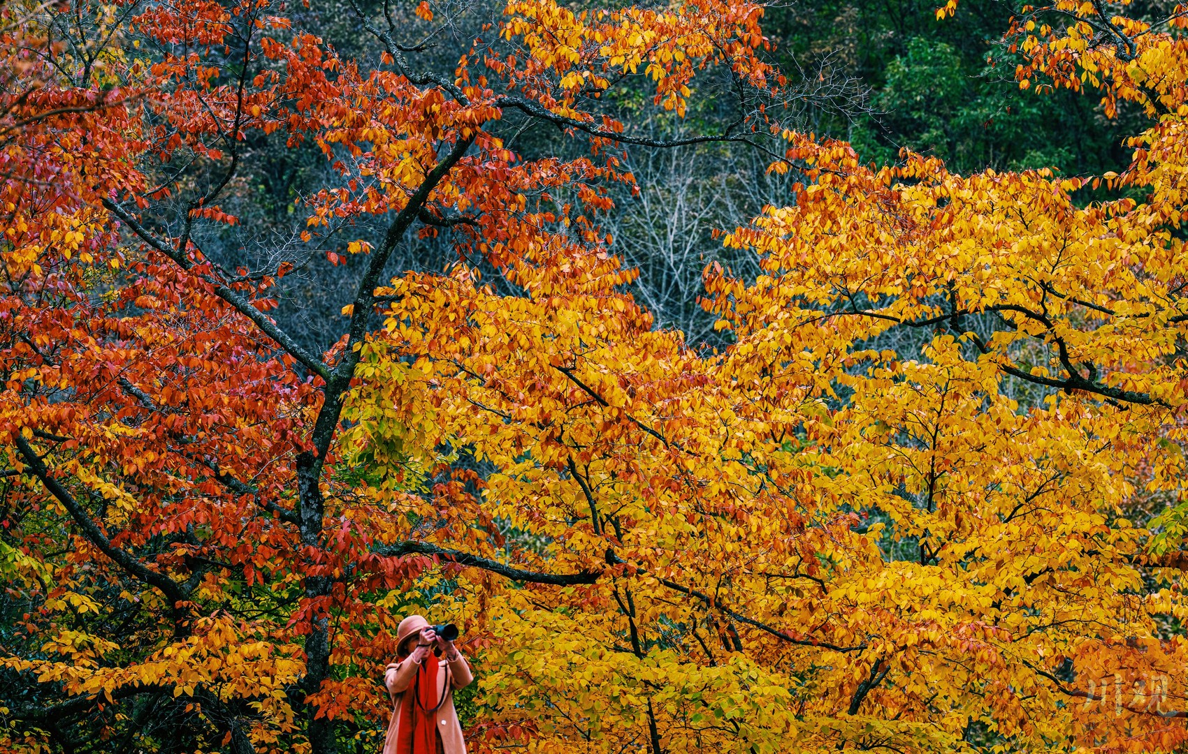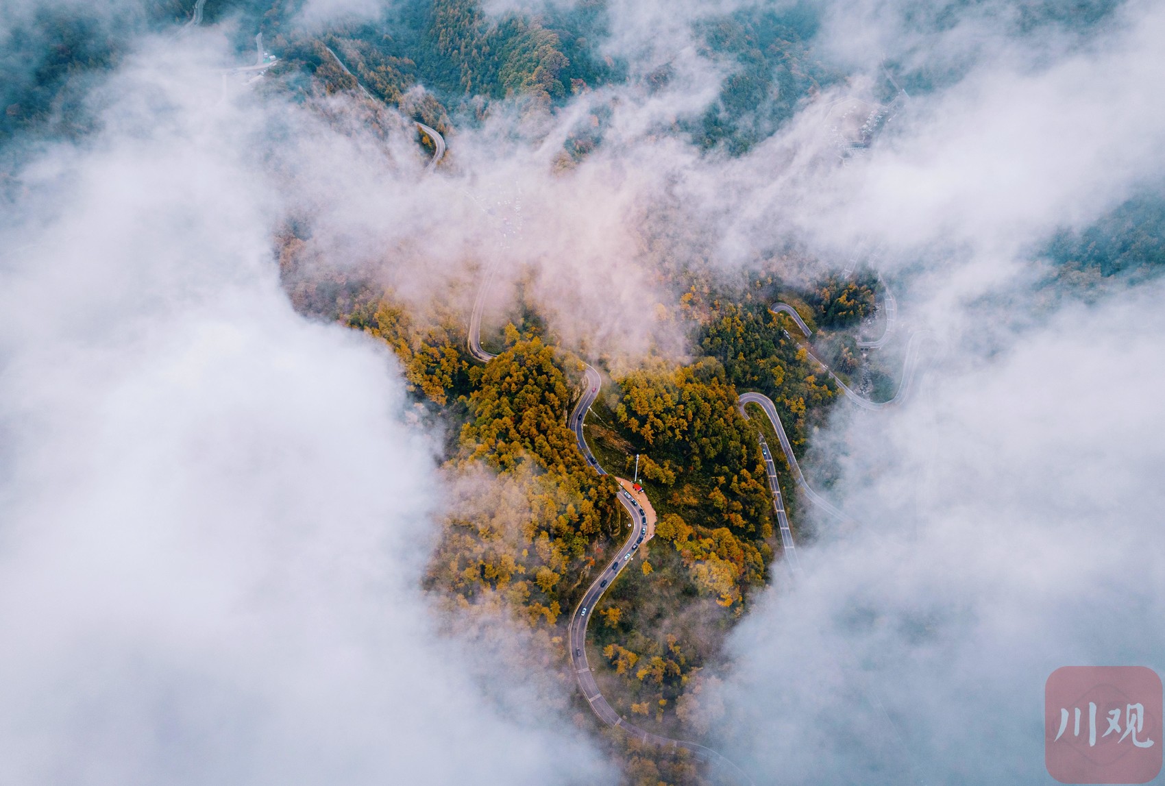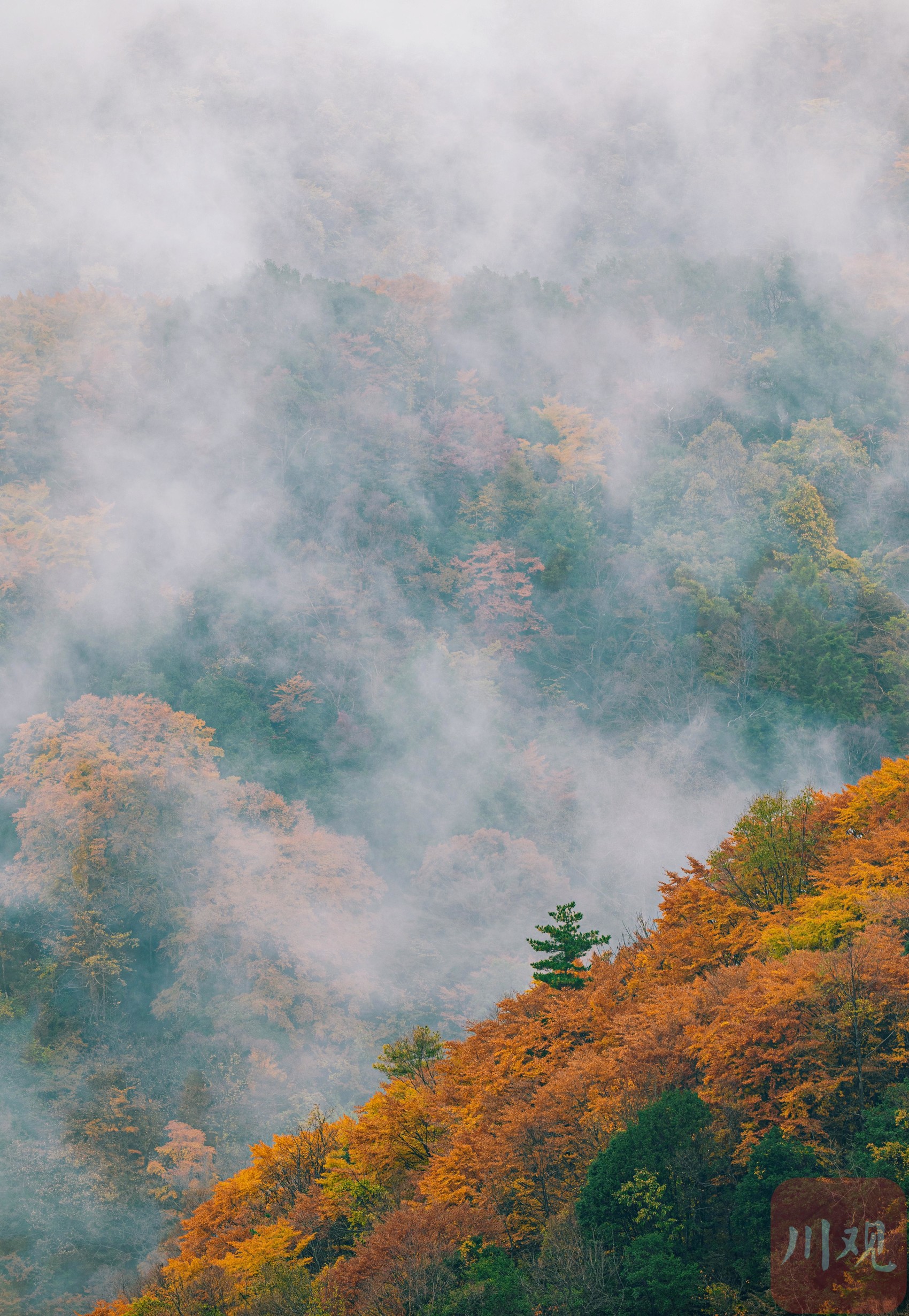 11月2日,广元市旺苍县米仓山盐井河峡谷的红叶彩林进入最佳观赏期。云海间,山顶上层林尽染、色彩斑斓,独特的植被景观吸引众多游客前来观赏。