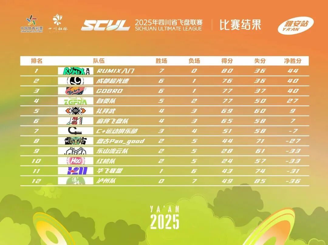 “中国体育彩票杯”2025年四川省飞盘联赛·雅安站圆满完赛。经过激烈对决,联赛第5-7轮战罢,各队在积分榜上的排名如上图所示。