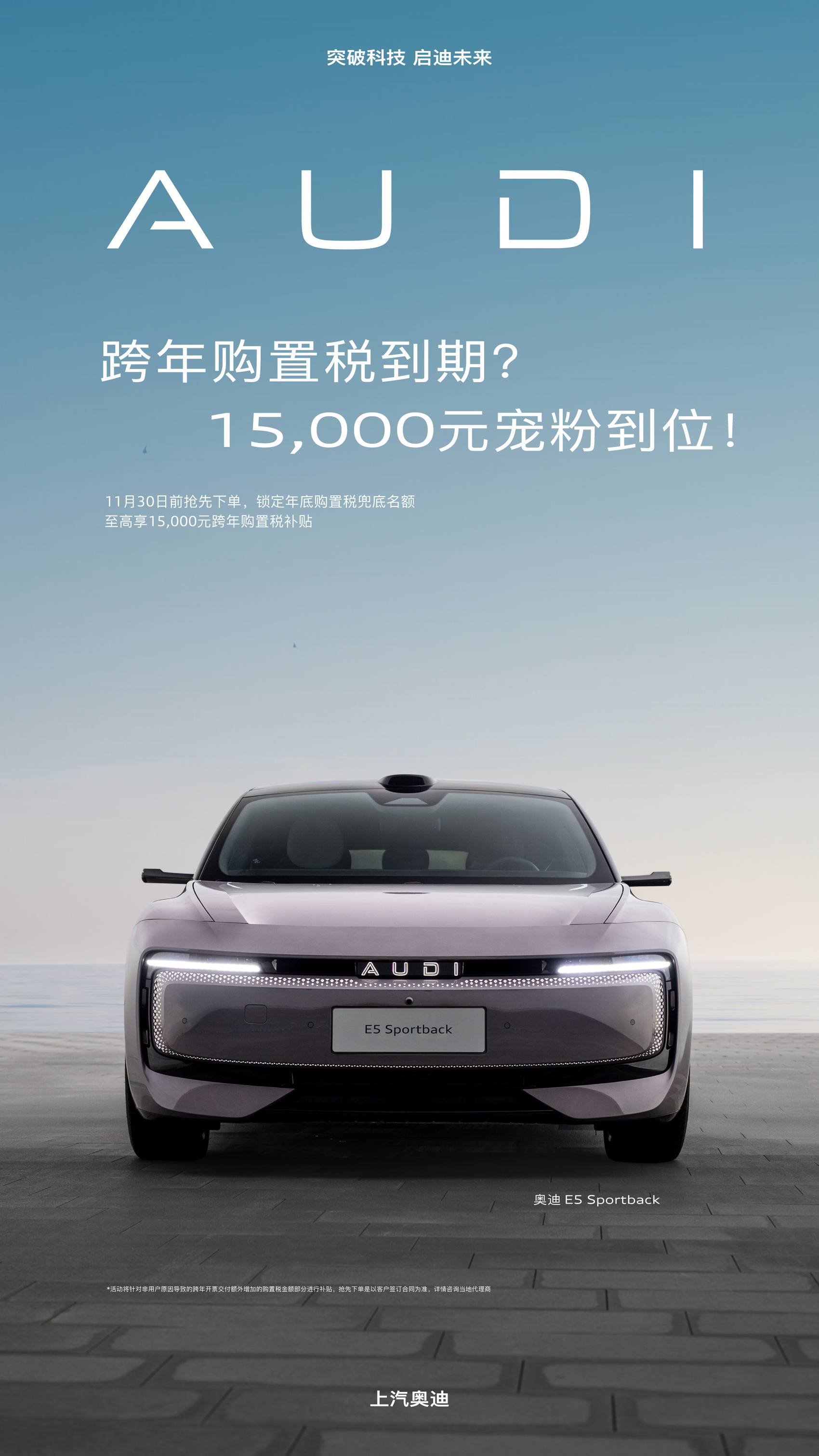 上汽奥迪是最近一个加入购置税“兜底”的汽车品牌。该汽车品牌在11月3日宣布,针对奥迪E5 Sportback推出跨年购置税补贴计划。11月30日前下单,如因非用户原因导致车辆在2026年交付,即可享受至高1.5万元的购置税补贴。