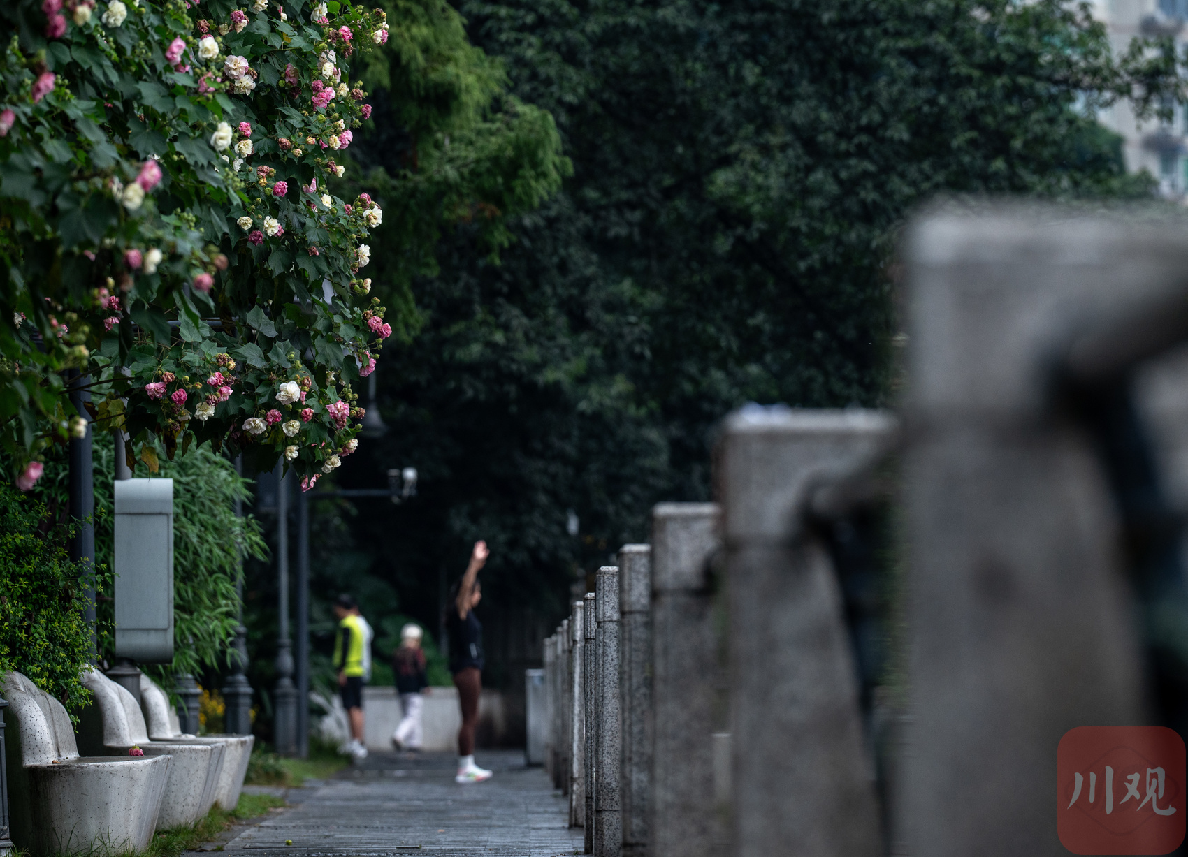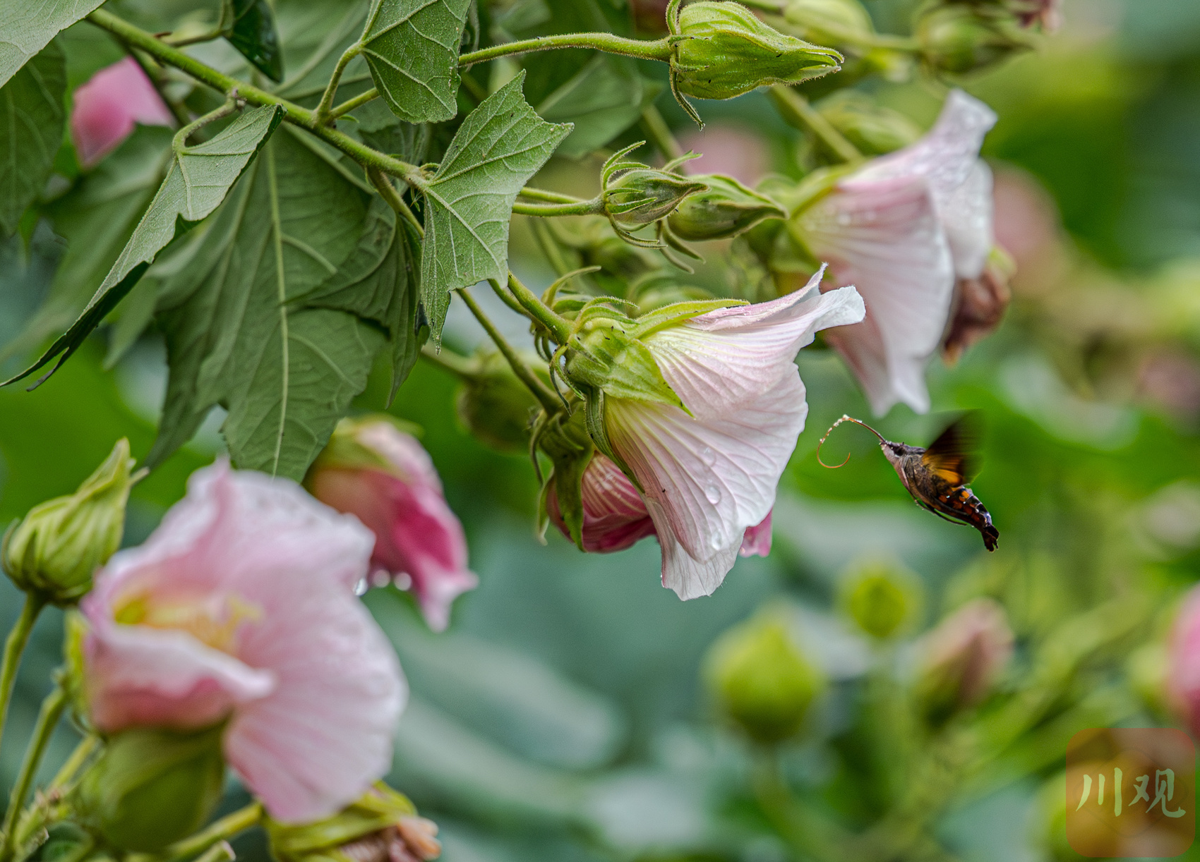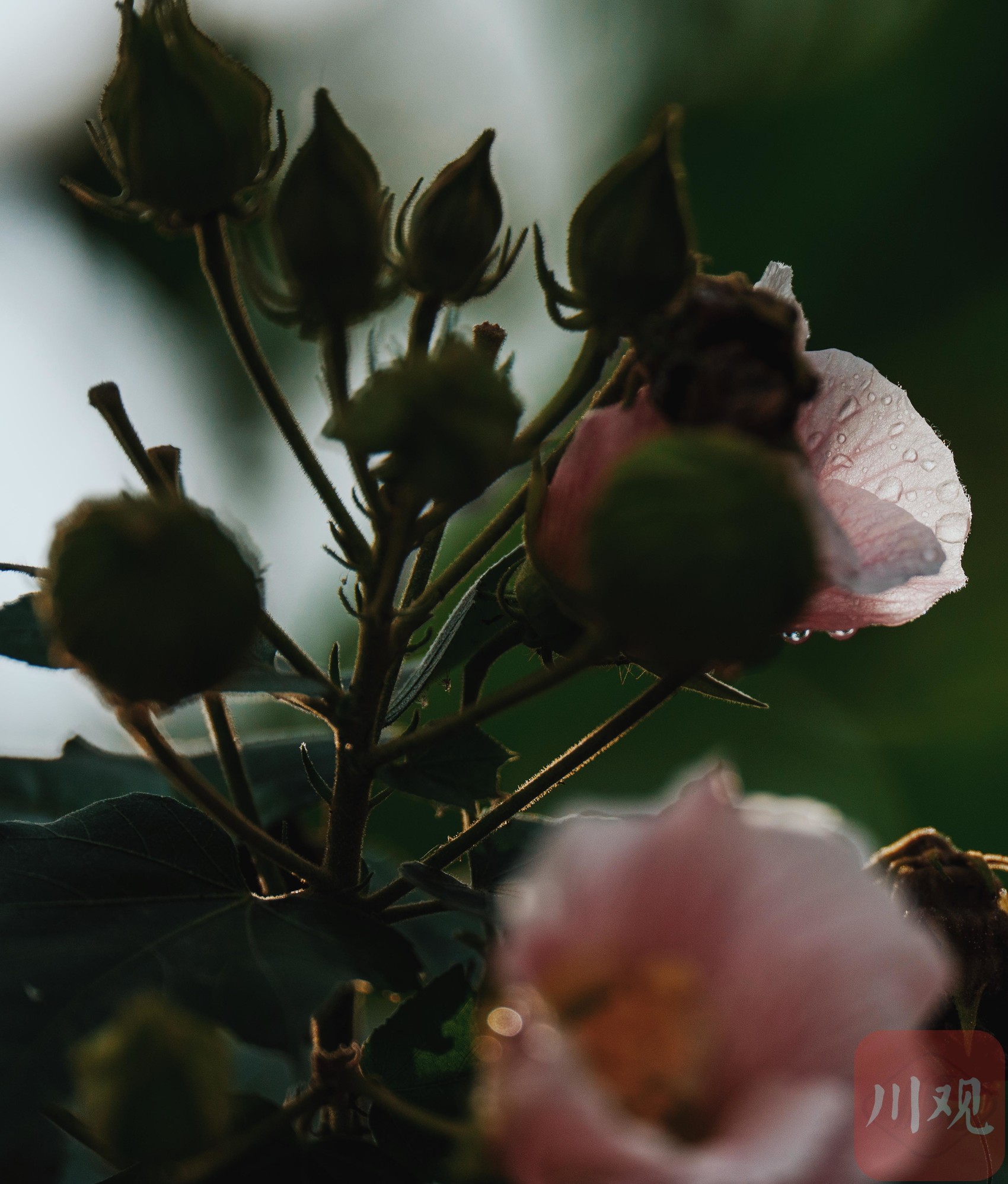 细看雨中芙蓉,更显其独特风韵。花色一日三变,从清晨的素白到黄昏的深红,宛若一场优雅的独舞。这位成都的“老朋友”从不与百花争春,越是寒深露重,越是精神抖擞。雨珠轻缀花瓣,仿佛凝结了千年古城的文脉雅韵。