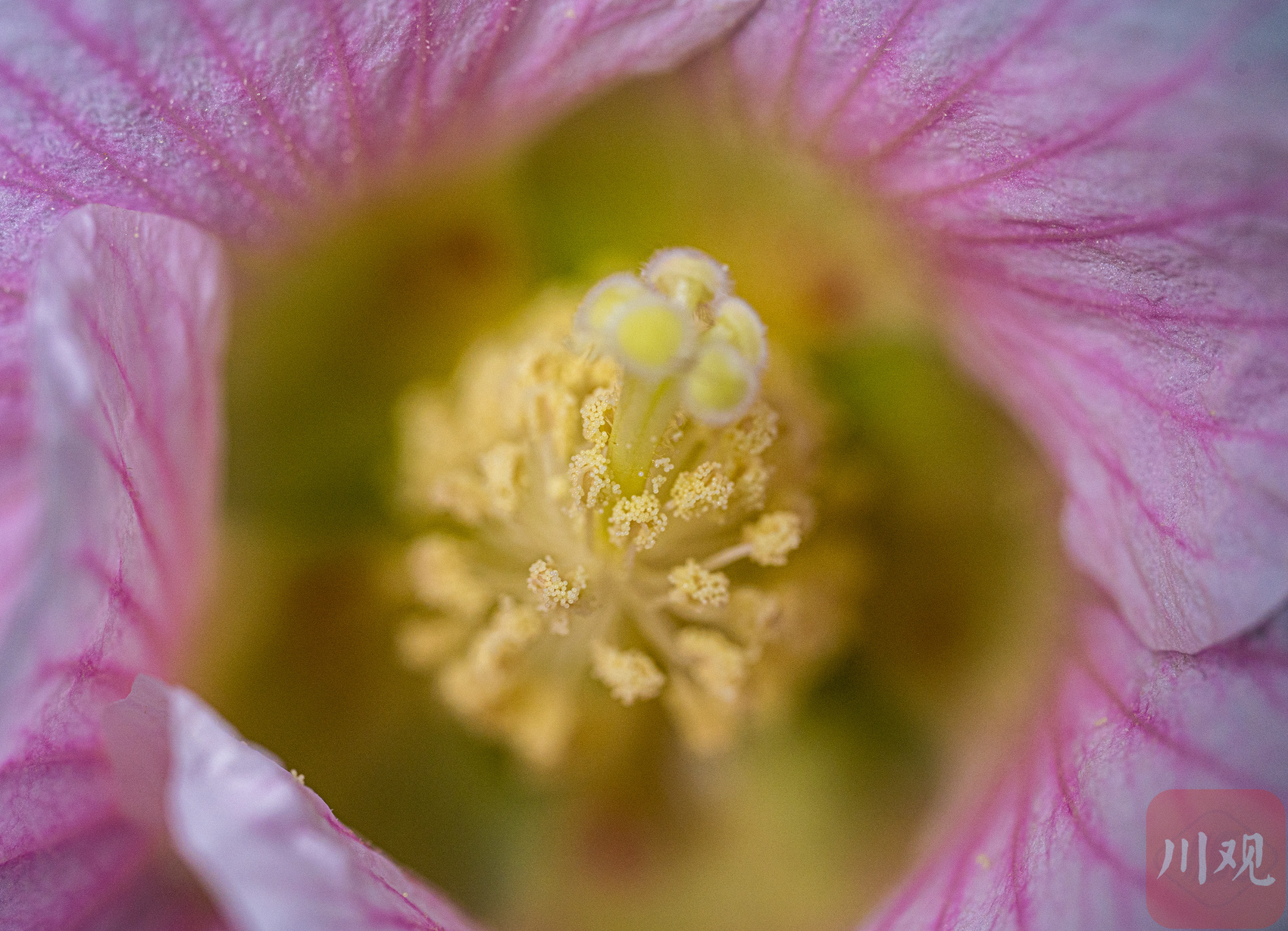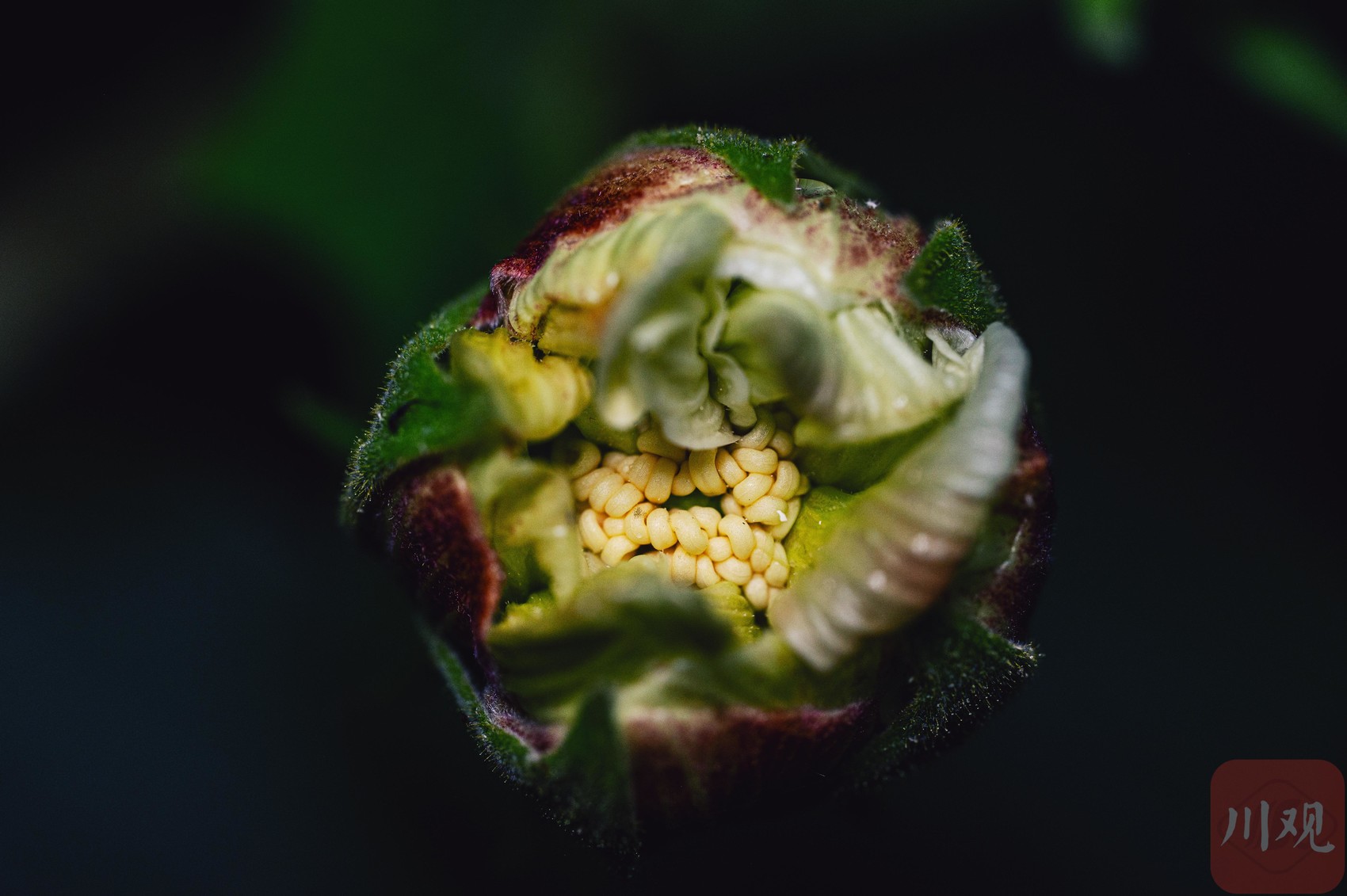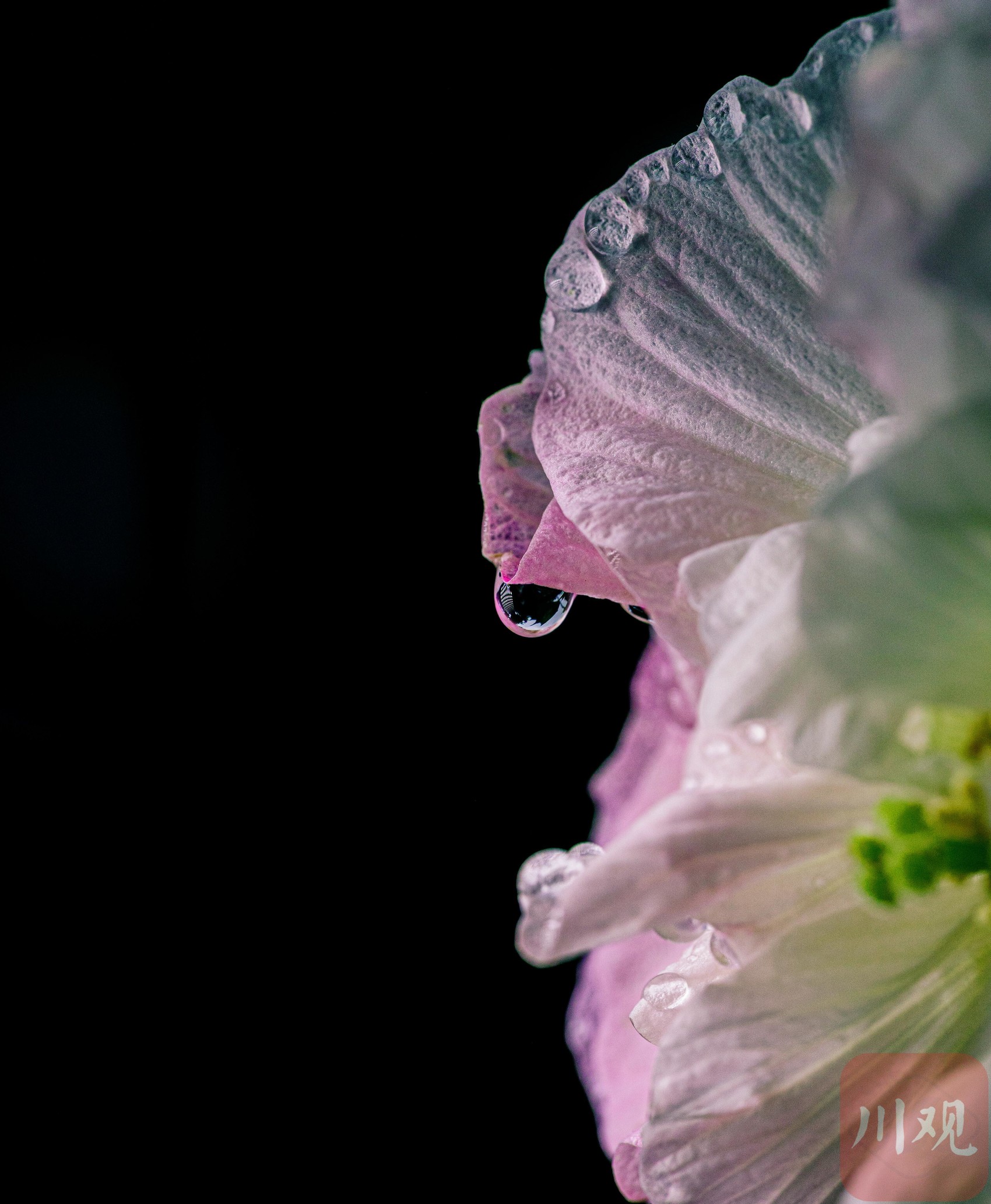 细看雨中芙蓉,更显其独特风韵。花色一日三变,从清晨的素白到黄昏的深红,宛若一场优雅的独舞。这位成都的“老朋友”从不与百花争春,越是寒深露重,越是精神抖擞。雨珠轻缀花瓣,仿佛凝结了千年古城的文脉雅韵。