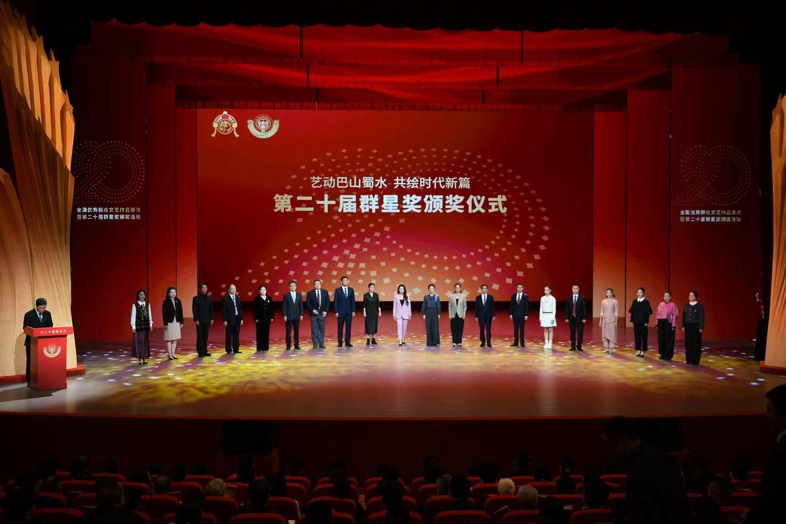 11月4日,由文化和旅游部、重庆市人民政府、四川省人民政府主办的“大地情深”全国优秀群众文艺作品展演暨第二十届群星奖颁奖活动在重庆群星剧院举行,现场揭晓了群星奖各门类奖项。本届群星奖,四川省共选送12个入围作品(团队)参赛,最终,广元市音乐作品《家谱》、成都市舞蹈作品《酒曲踩出幸福谣》、凉山州舞蹈作品《阿妈就是那座山》、成都童声合唱团等4个作品(团队)荣获第二十届群星奖,获奖和入围作品(团队)数量均创历史新高,位列全国第一方阵。