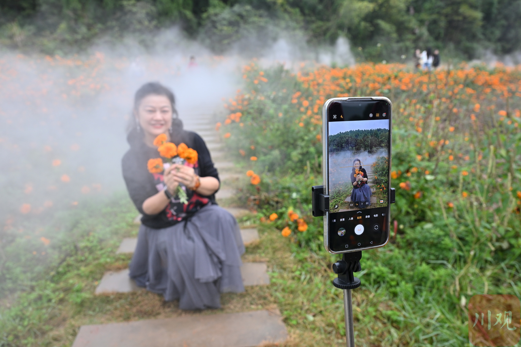 游客在菊花花海里留影。