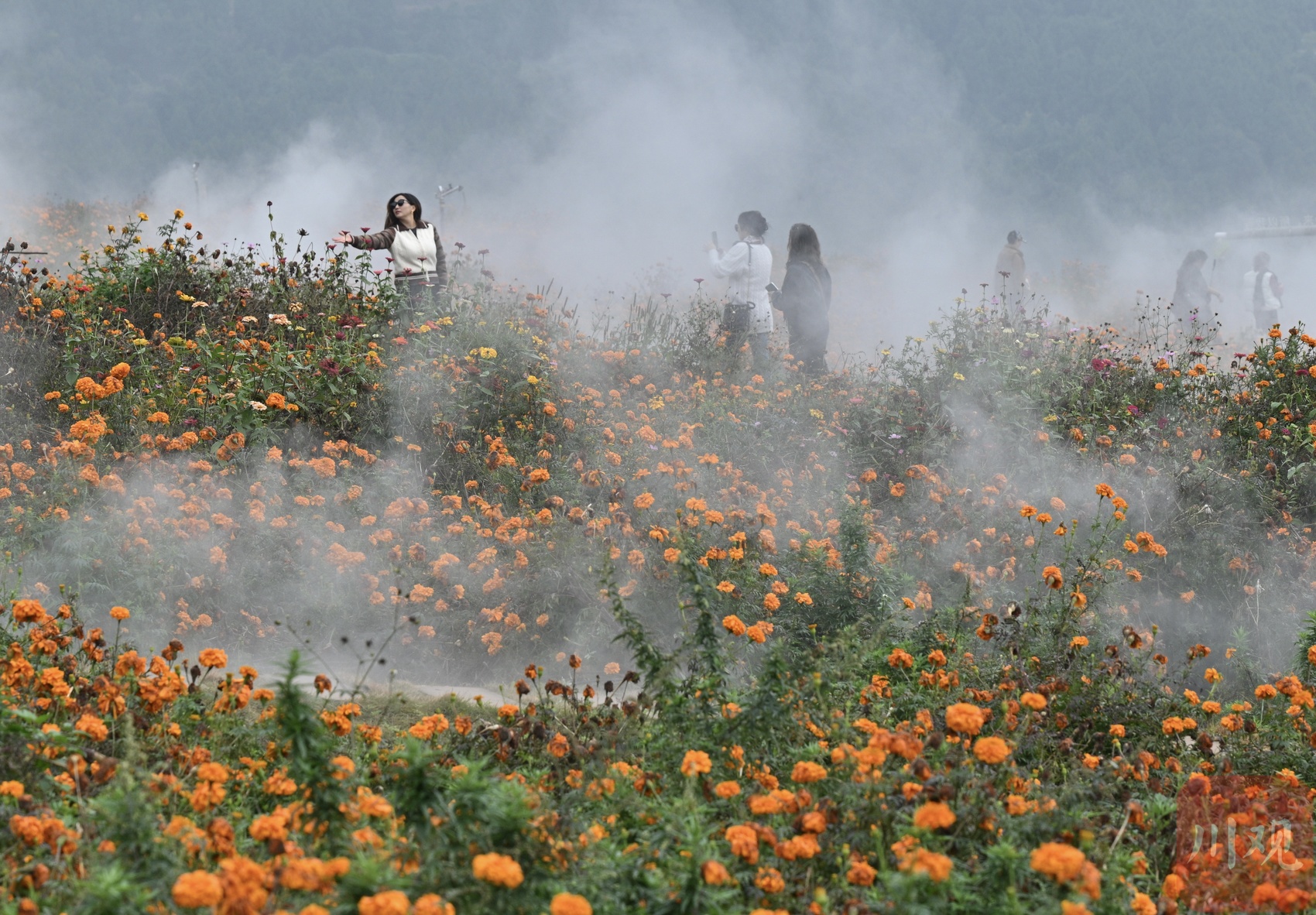 游客在菊花花海里游玩。