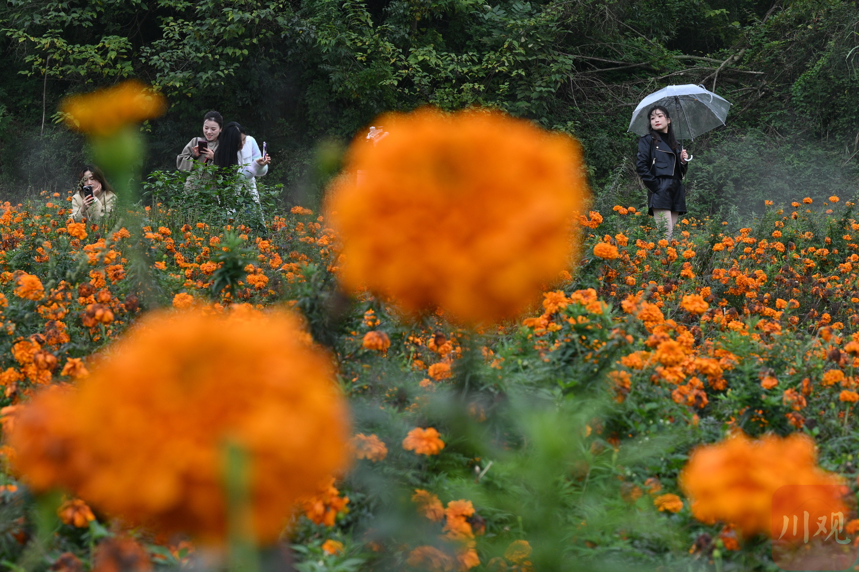 走进产业园里,漫山遍野的万寿菊竞相绽放,橙黄的花海令人震撼。不少游客慕名前来,或惬意漫步拍照打卡,或露营野炊,成为了园区内一道靓丽的风景线。