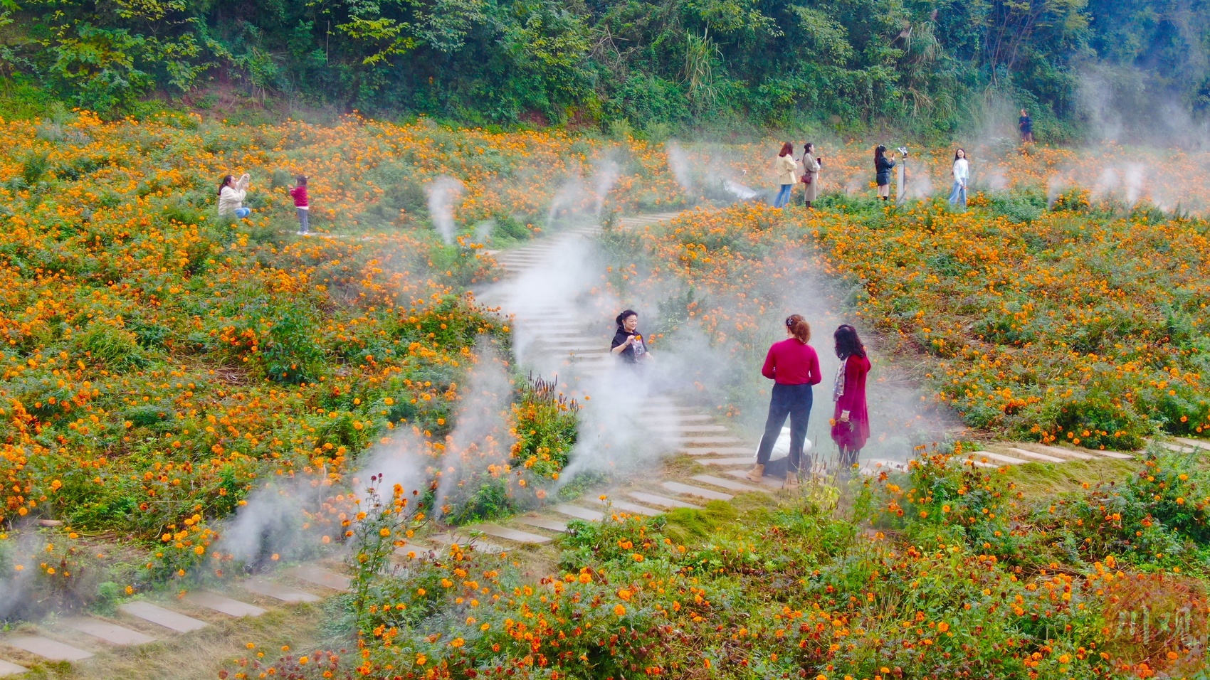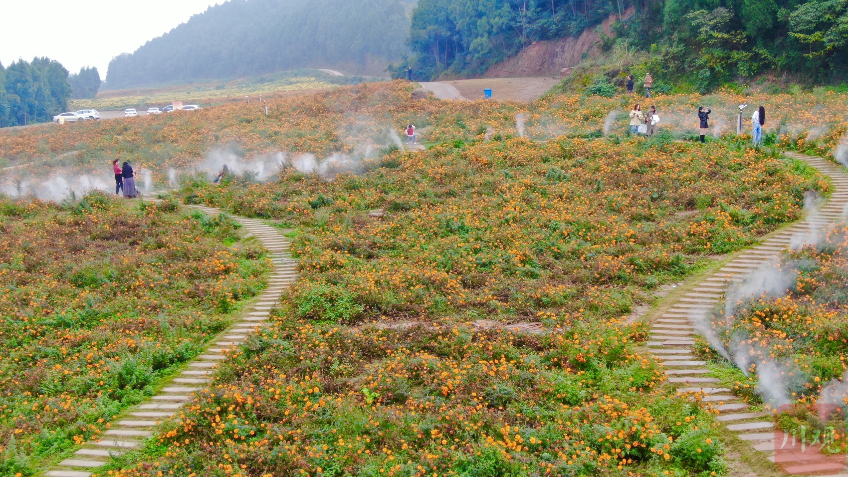 金菊映山河,漫山铺锦绣,百亩菊花铺成一片浪漫花海。