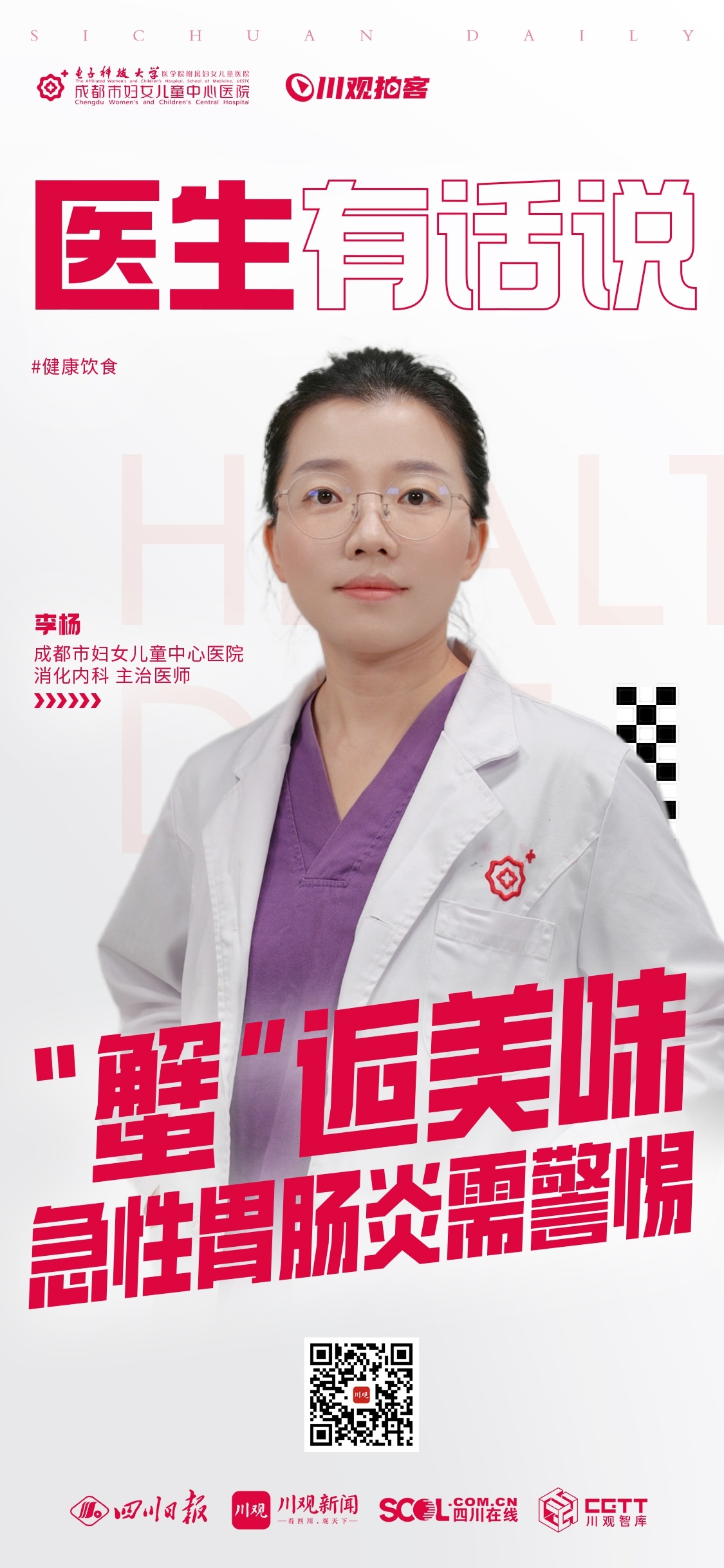 本期栏目,来自成都市妇女儿童中心医院消化内科的主治医师李杨,就跟大家聊一聊为什么食用蟹肉可能引发急性胃肠炎,以及如何健康享用美味的大闸蟹。