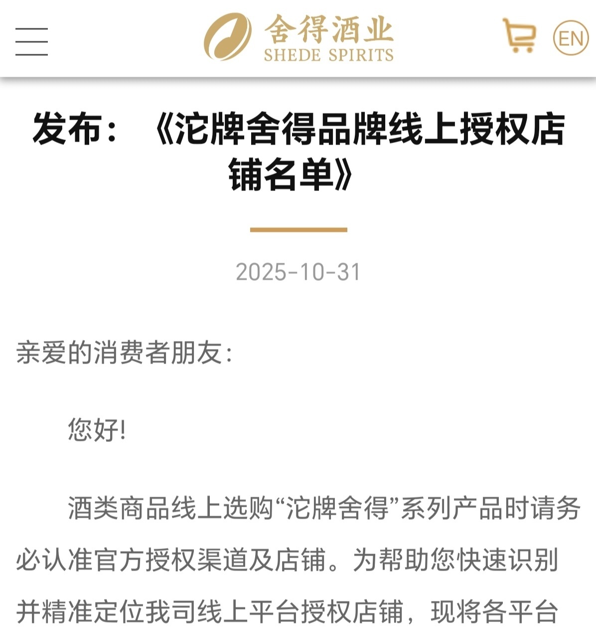 在“双11”逐渐走向高潮之际,白酒行业的渠道规范行动也在升级。舍得酒业于11月1日公布了528家沱牌舍得品牌线上授权店铺名单,提醒消费者“酒类商品线上选购‘沱牌舍得’系列产品时请务必认准官方授权渠道及店铺”。