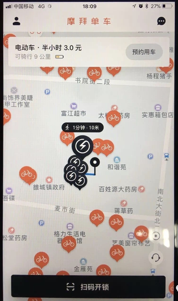 “摩拜电单在手机APP上的定位显示为黑色闪电,车头可放置手机,按住座椅下方把手可轻松调节车座高度,单车车头车尾处均有剩余电量显示,摩拜工作人员将通过后台实时监控车辆电量,及时更换电池,单车车头处安设有照明灯,方便夜间使用。”运营方工作人员介绍称,骑行摩拜电动单车扫码解锁后,需要蹬脚踏板3圈左右,让单车产生起步助力,起步后按下电助力转把,单车即可电动巡航,行驶途中可通过电助力转把调节行驶速度,到达目的地后长按车座下方二维码按钮锁车。