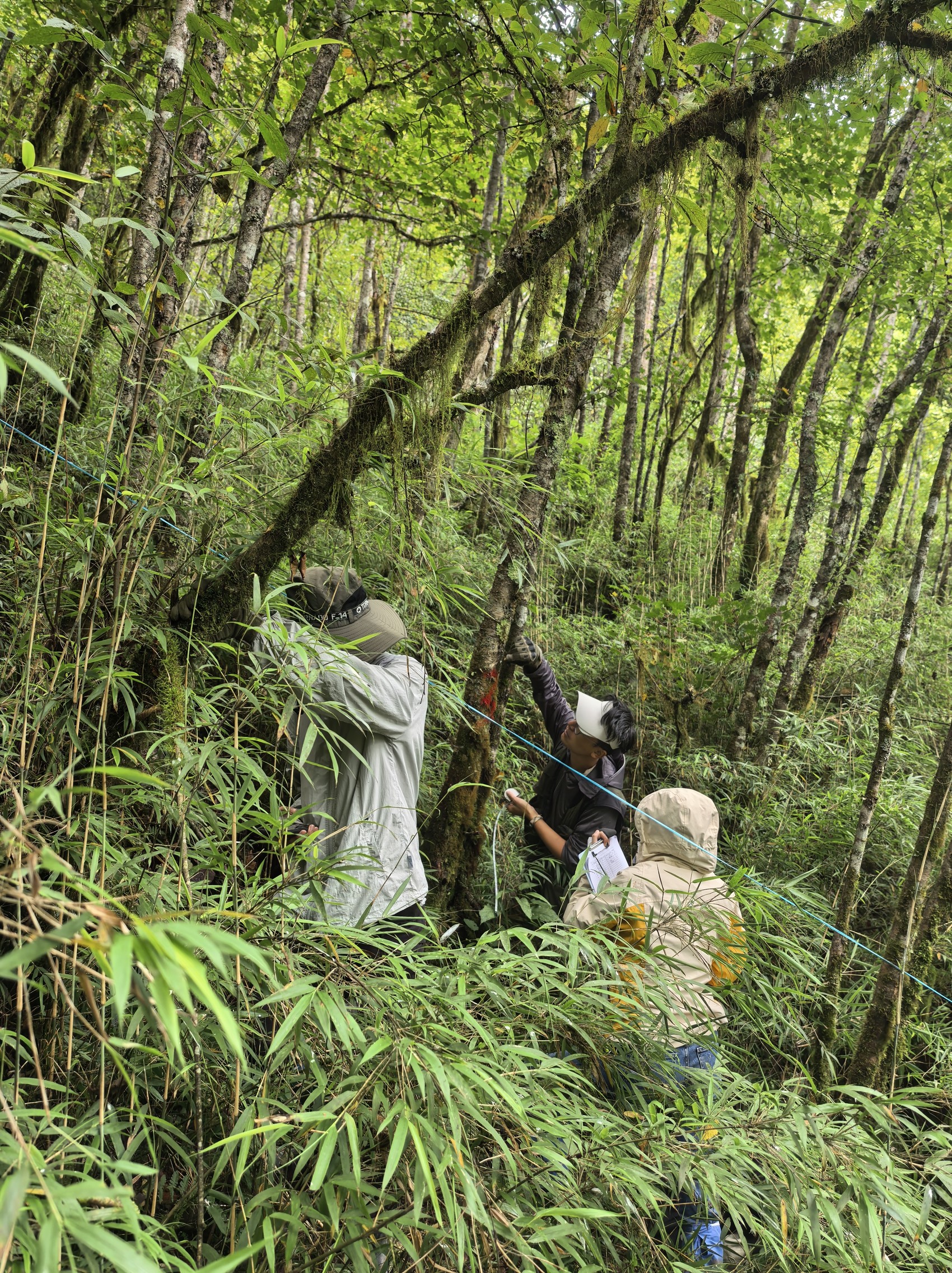 宝兴工作人员在碳普惠样地里测量林木的相关数据。受访者供图
