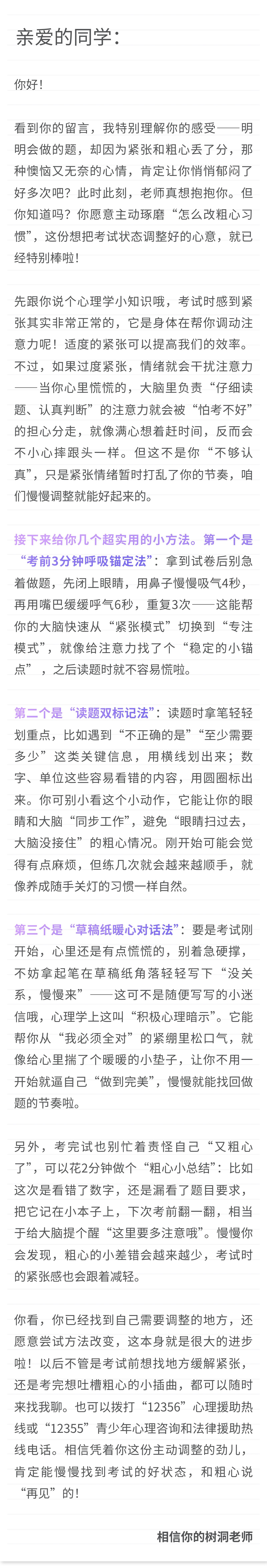 一位高中女生:在考试中,总是很紧张,看题还不仔细,粗心大意的习惯咋改啊?