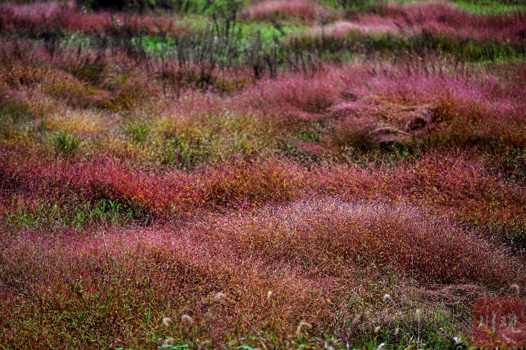 青龙湖湿地公园绯红色的乱子草。
