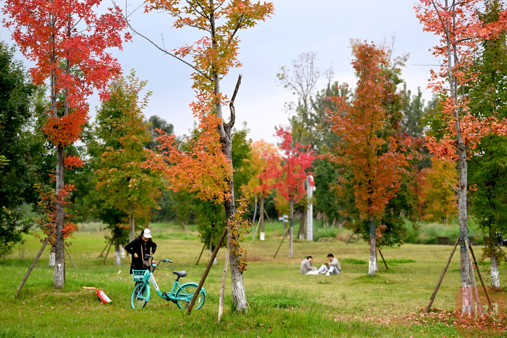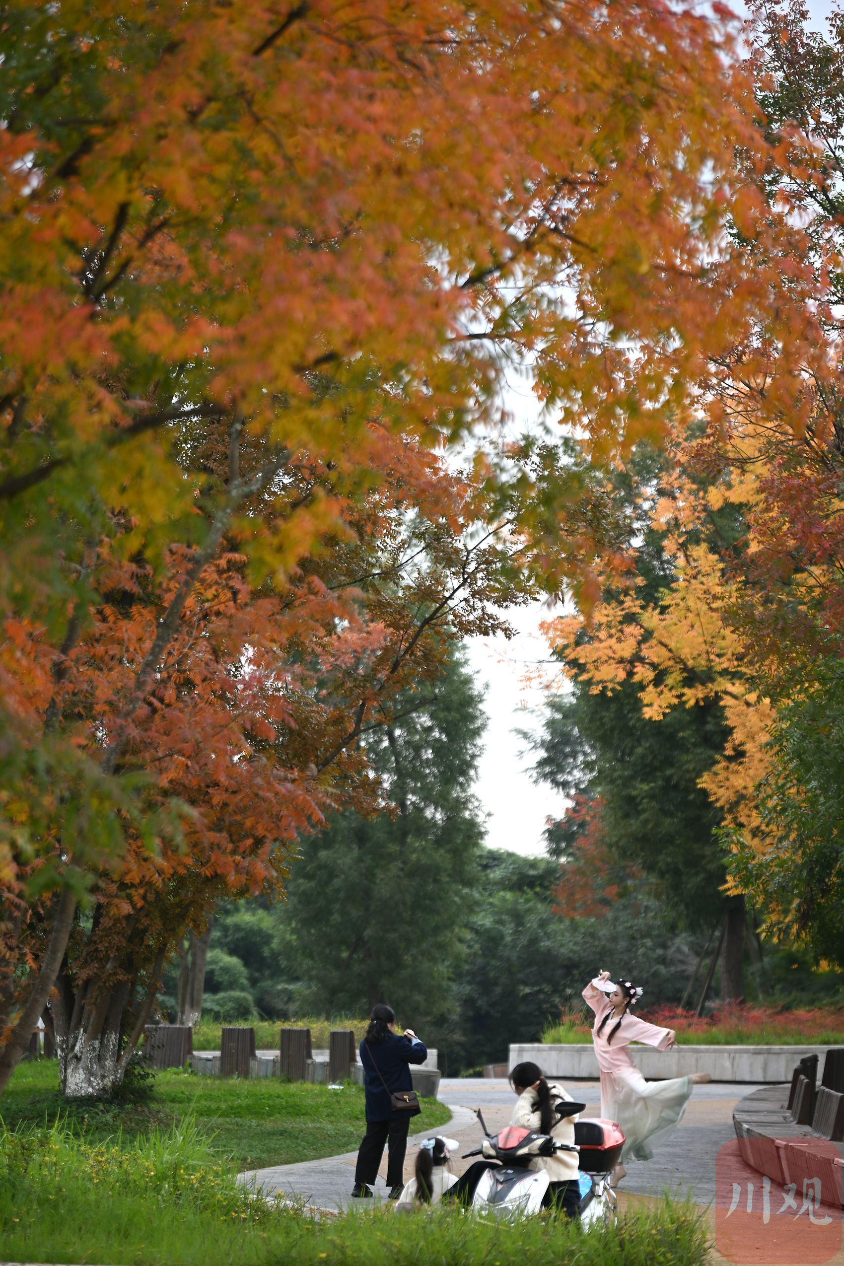 当日虽非周末,但公园内已有不少市民前来游赏,其中不乏趁午休前来打卡的上班族。在青龙湖附近上班的刘女士便约上同事专程前来散步,望着林间绚烂色彩,她忍不住感叹:“要是出点点太阳,这里的景更美。” 除了即时赏景,刘女士还盘算着周末的行程:“这个周末会来露营,今天就当是先来选址了。周末还得早点来,要不然位置都没有。”