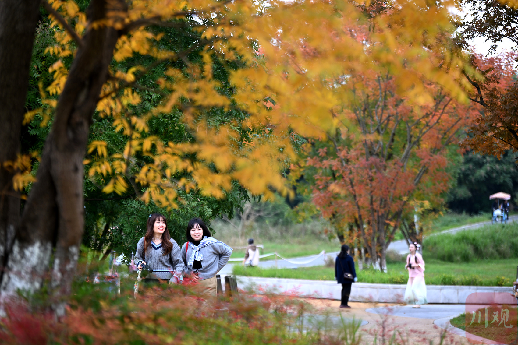 市民在彩林下拍照。