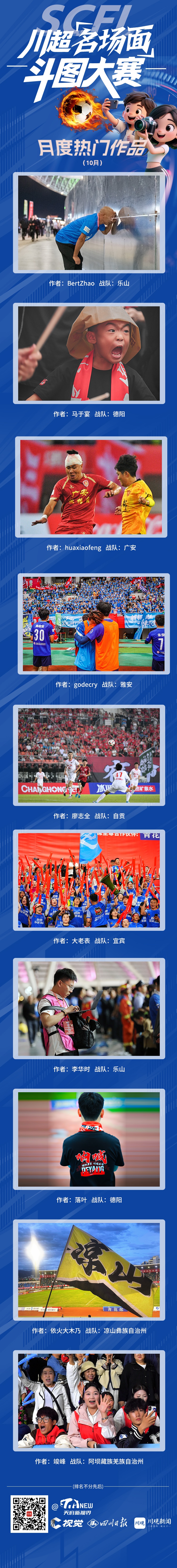 神图并肩战川超,狂欢热潮持续升温!由四川日报·川观新闻、天府新视界发起的“‘川超’名场面斗图大赛”,自10月1日启动后点燃全川创作热潮,四周周赛投票正式收官,月度(10月)热门作品新鲜出炉,速来围观,感受球迷的热爱,解锁摄影师的拍摄心得。