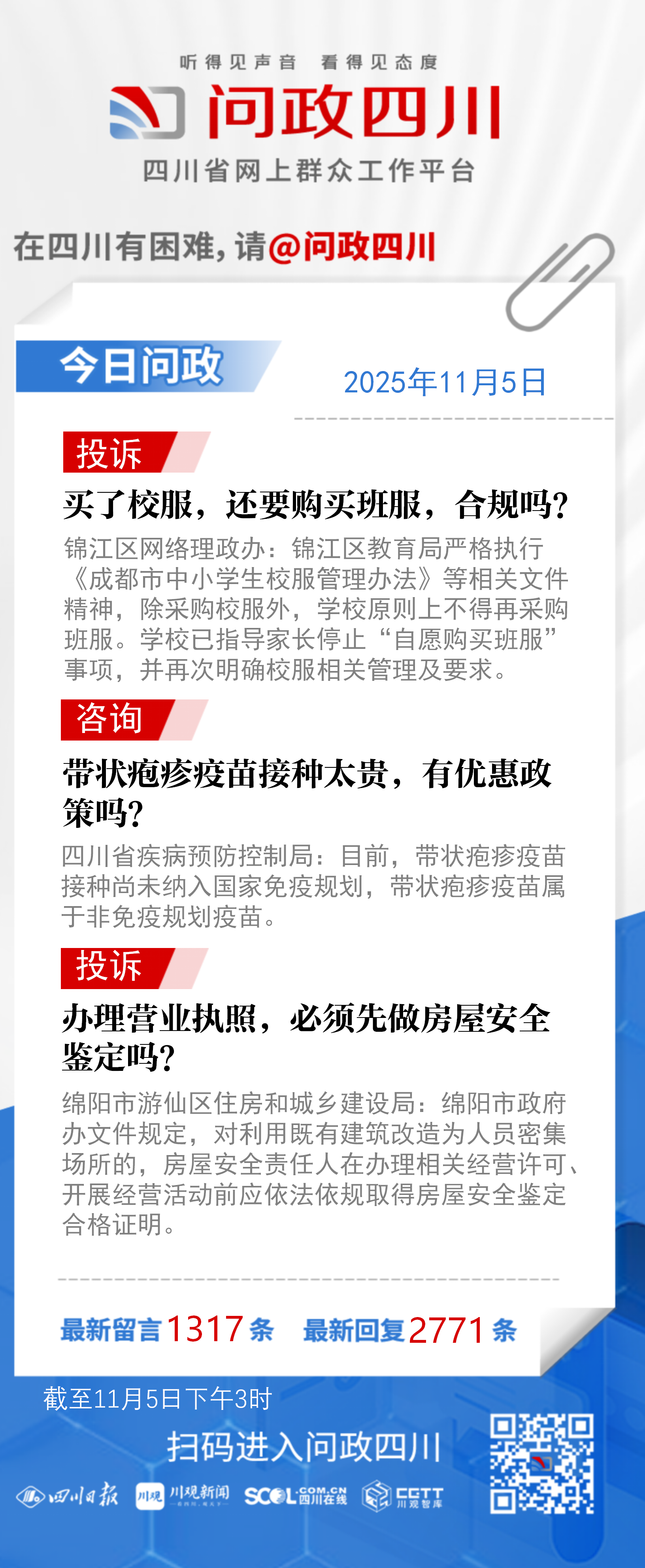 在四川有困难,找问政四川。如果您在四川遇到了操心事、烦心事、揪心事,请登录“四川省网上群众工作平台—问政四川”或拨打问政四川热线(028-96001)留言反映、求助或建议。我们将充分发挥平台的互动联系作用及舆论监督功能,第一时间传递民声,推动问题得以及时解决——听得见声音,看得见态度。