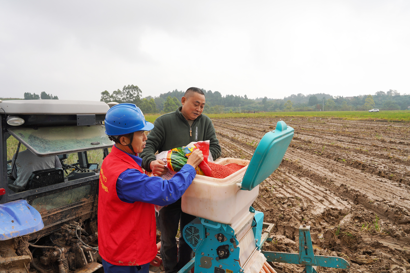 电力员工帮种户把麦种倒进播种机。(苟华彬 摄)