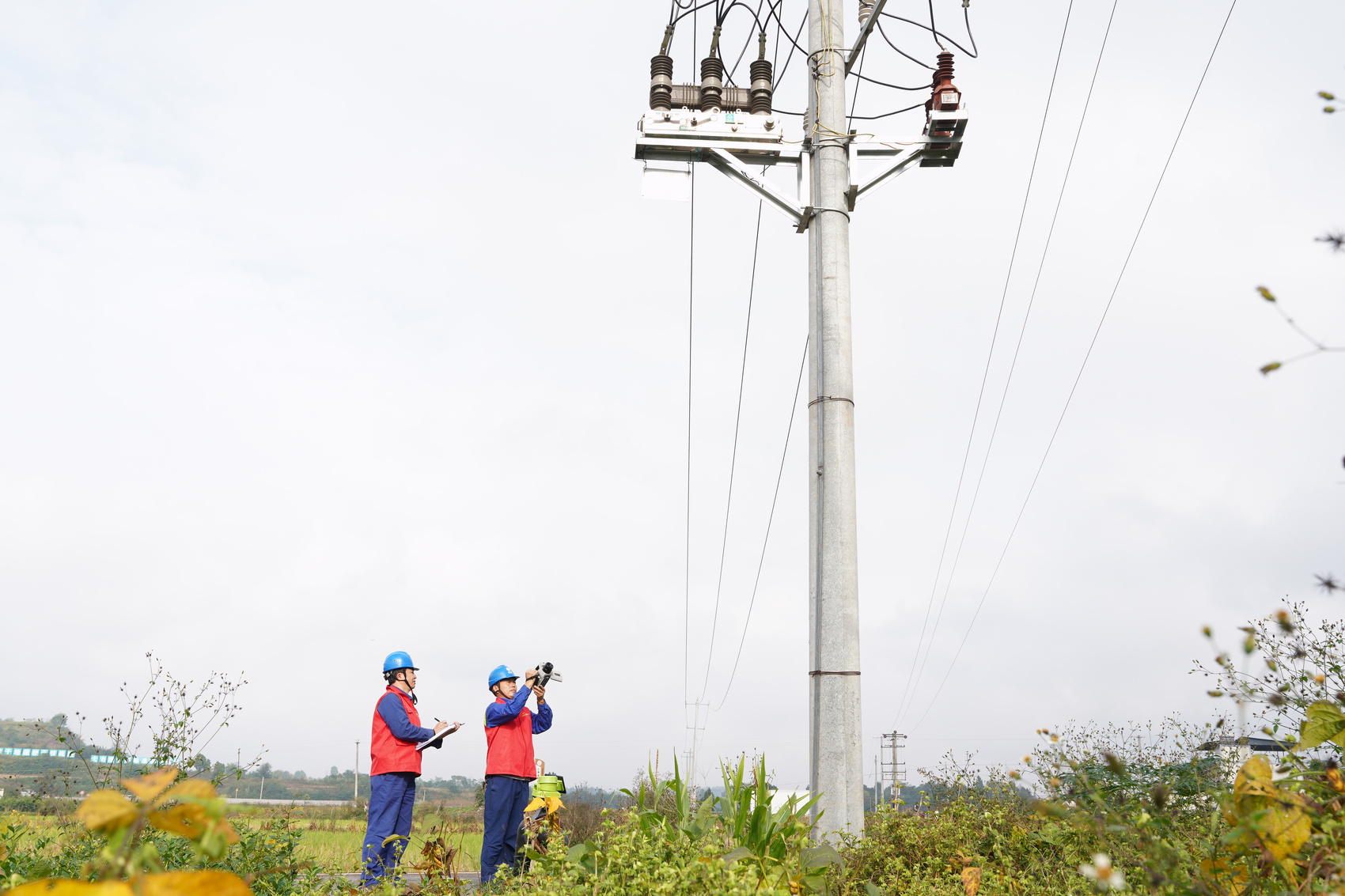 电力员工对田间的电力设备开展红外测温巡视。(苟华彬 摄)