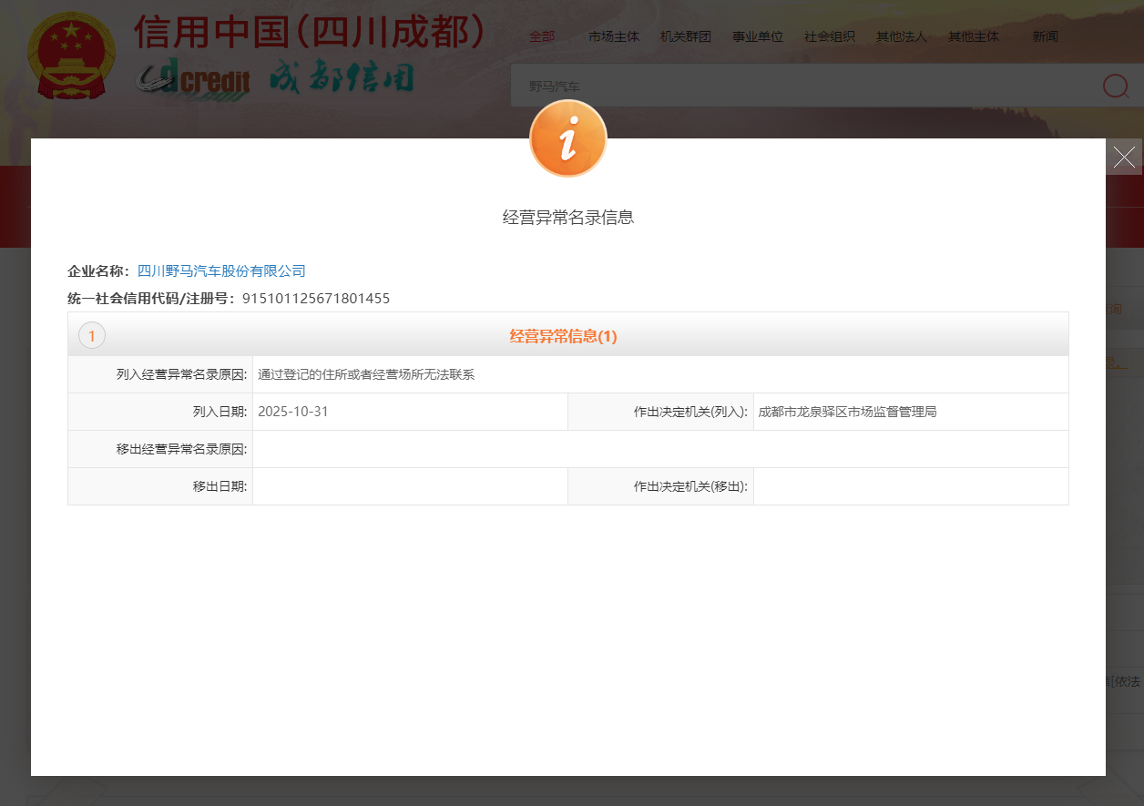11月5日,川商传媒记者从成都市公共信用信息中心网站获悉,四川野马汽车股份有限公司(下称“野马汽车”)于近日因通过登记的住所或者经营场所无法联系,被成都市龙泉驿区市场监督管理局列入经营异常名录。