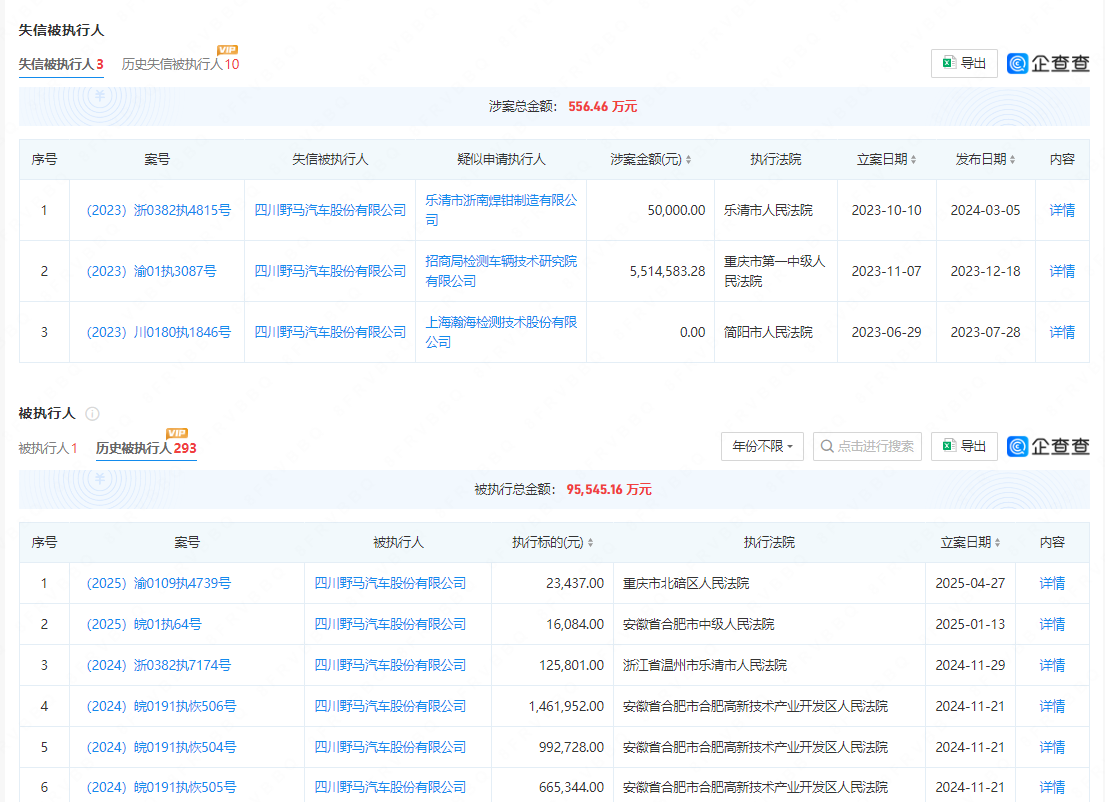 另据企查查显示,10月23日,野马汽车新增一则被执行人信息,执行标的41.4万元,执行法院为四川省成都市简阳市人民法院。值得关注的是,该公司还存在多条限制消费令、失信被执行人及终本案件信息,历史被执行总金额超9亿元。