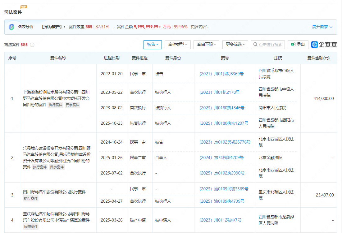 此外,企查查显示,野马汽车身为被告的司法案件多达585个,涉案金额或超百亿元,面临严峻的司法风险。