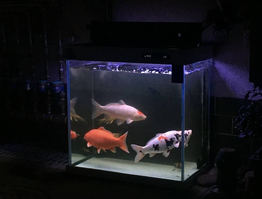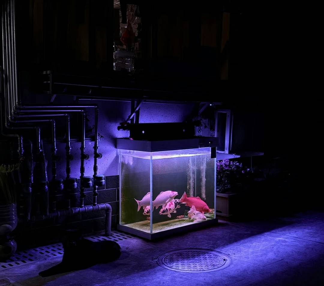 院子里,一单元一楼窗台下,一个长、高约一米的鱼缸占据了“C”位,一进院子,目光就不自觉地被它吸引。鱼缸里,三只胖锦鲤游来游去。旁边小区的水管、水表整齐排列着。别看白天这景象没什么特别的,一到晚上,当鱼缸亮起灯光,不少穿着时尚的年轻人就会进进出出,只为打卡这个藏在小巷里的“梦核”鱼缸。