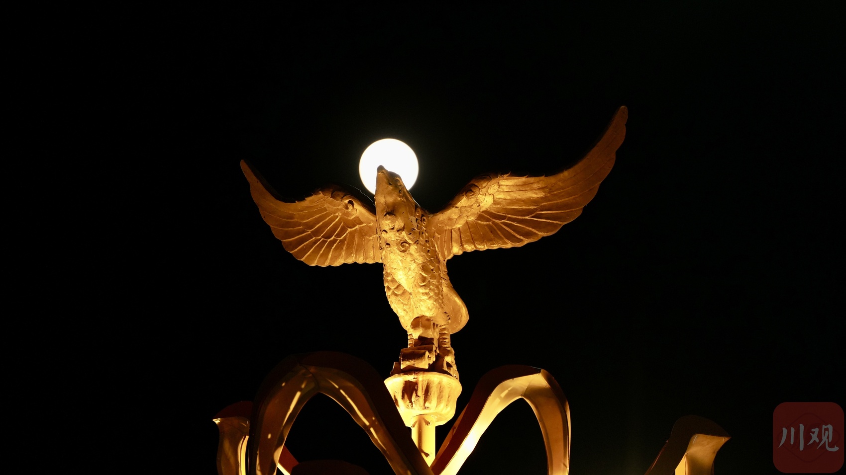 11月5日,四川省甘孜州巴塘县大鹏雕塑旁的路灯与年度最大月亮相映成趣。C视觉签约摄影师 张家坤 摄