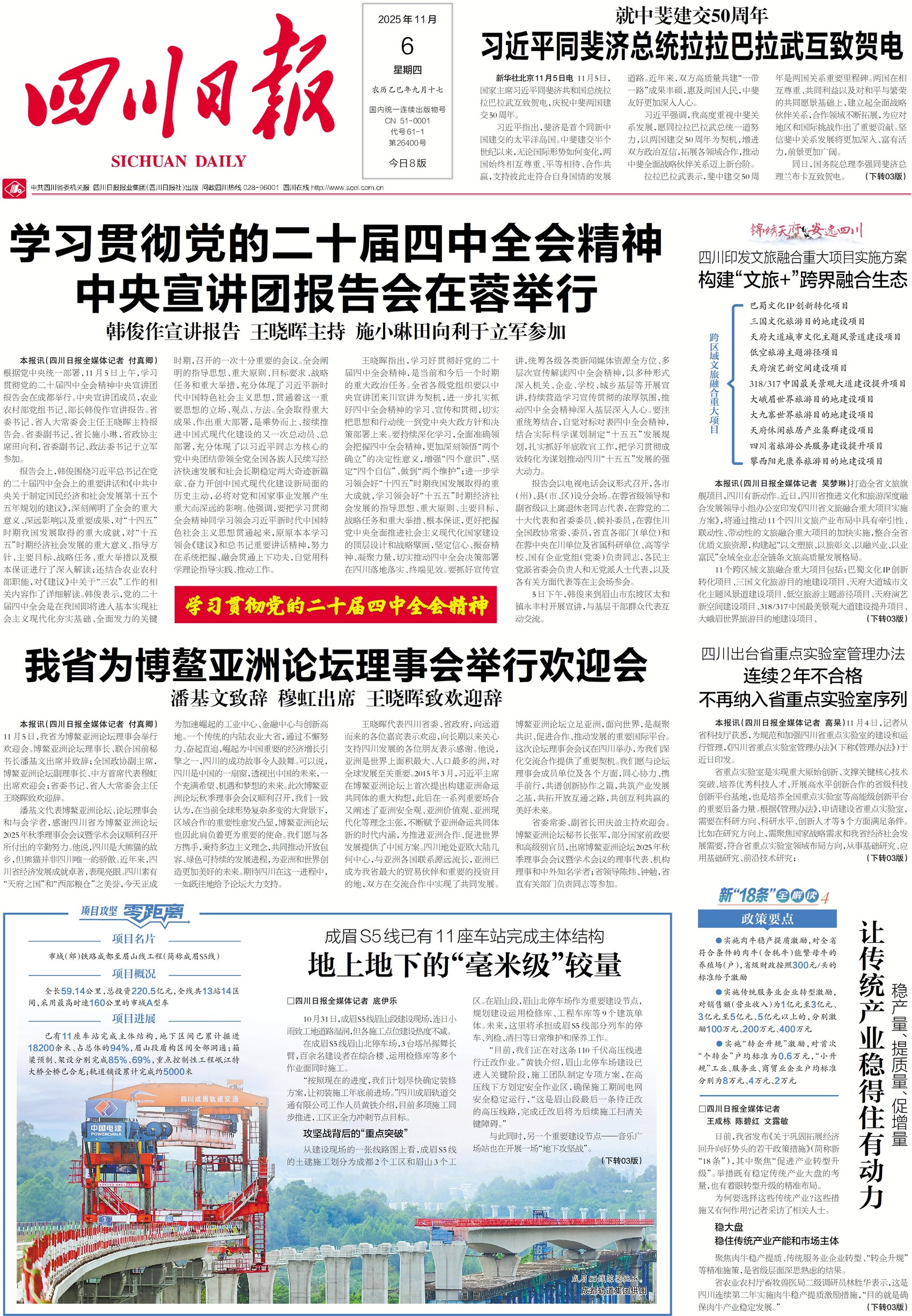 备受关注的成眉S5线传来最新进展——截至10月底,项目地下区间已累计掘进18200余米、占总体的94%;眉山段盾构区间全部洞通;箱梁预制、架设分别完成85%、69%,重点控制性工程岷江特大桥全桥已合龙;轨道铺设累计完成约5000米。今日一版,看建设者们与天气赛跑、与时间竞速。