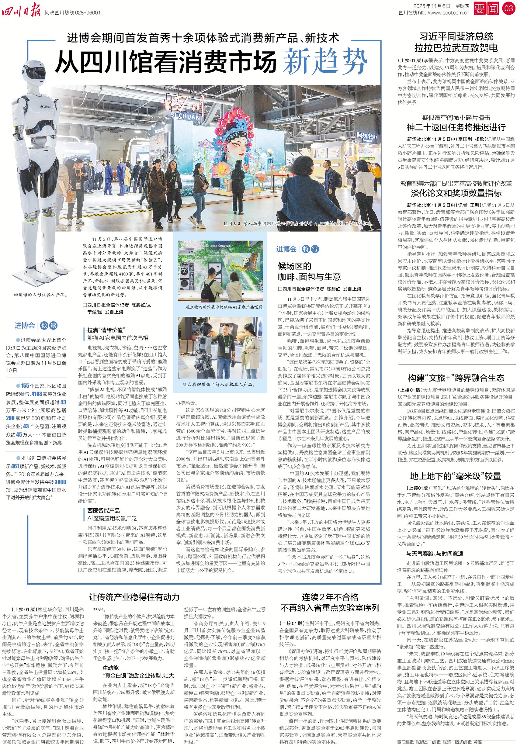 昨日,第八届中国国际进口博览在上海开幕。在本届进博会四川馆,四川企业带来的AI产品大显风采:造型呆萌可爱、智能化十足的熊猫AI家电,为未来家庭带来满满互动体验;蕴藏“黑科技”的AI魔镜,能30秒内测出25种健康指标,为人们的健康保驾护航……今日三版,看新时代的“四川造”以创新引领未来消费市场。