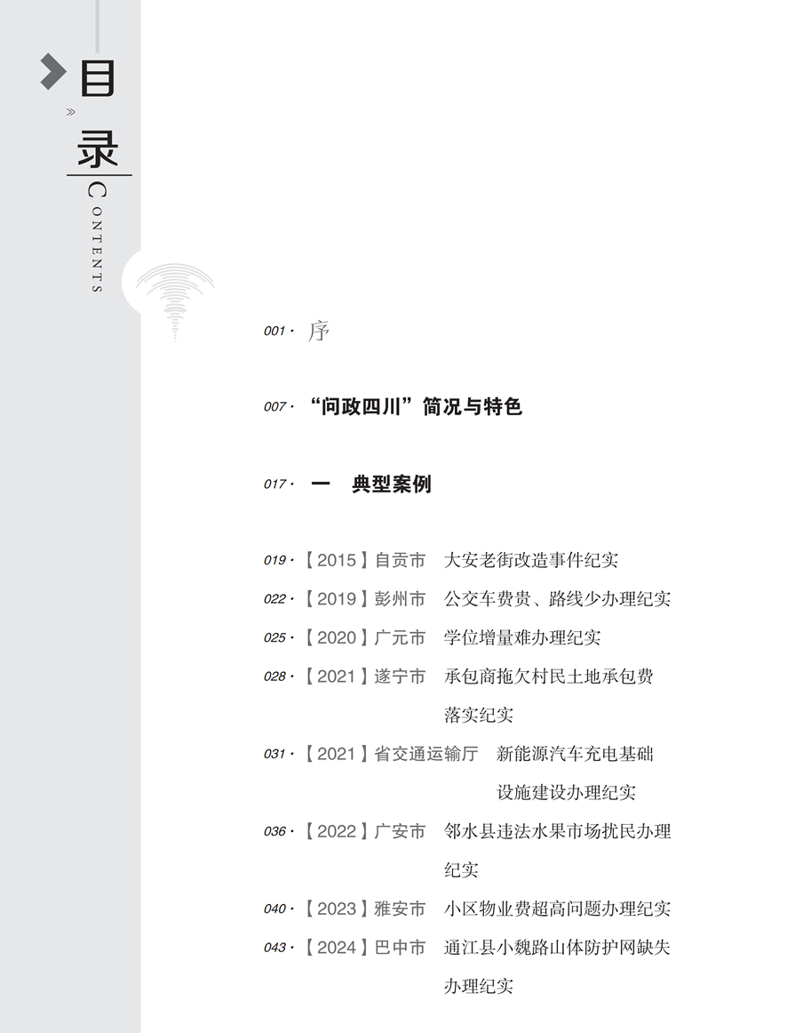 由此,《看见你》聚焦“问政四川”十年经验,联动业界、政界、学界,以案例选编、记者札记、专业解析相结合的方式,探解走好群众路线的协作之道,而不囿于狭义的媒体治理或电子政务。具体而言,全书精选“问政四川”平台上的8个典型案例,涵盖公共安全、市政建设、教育学位等多个民生领域,以及9篇记者手记,10篇省内市州十地网信办、相关机构的参与心得和4篇学术论文,立体呈现了媒体、政府与公众在“问政—理政—共治”过程中的互动与成长。