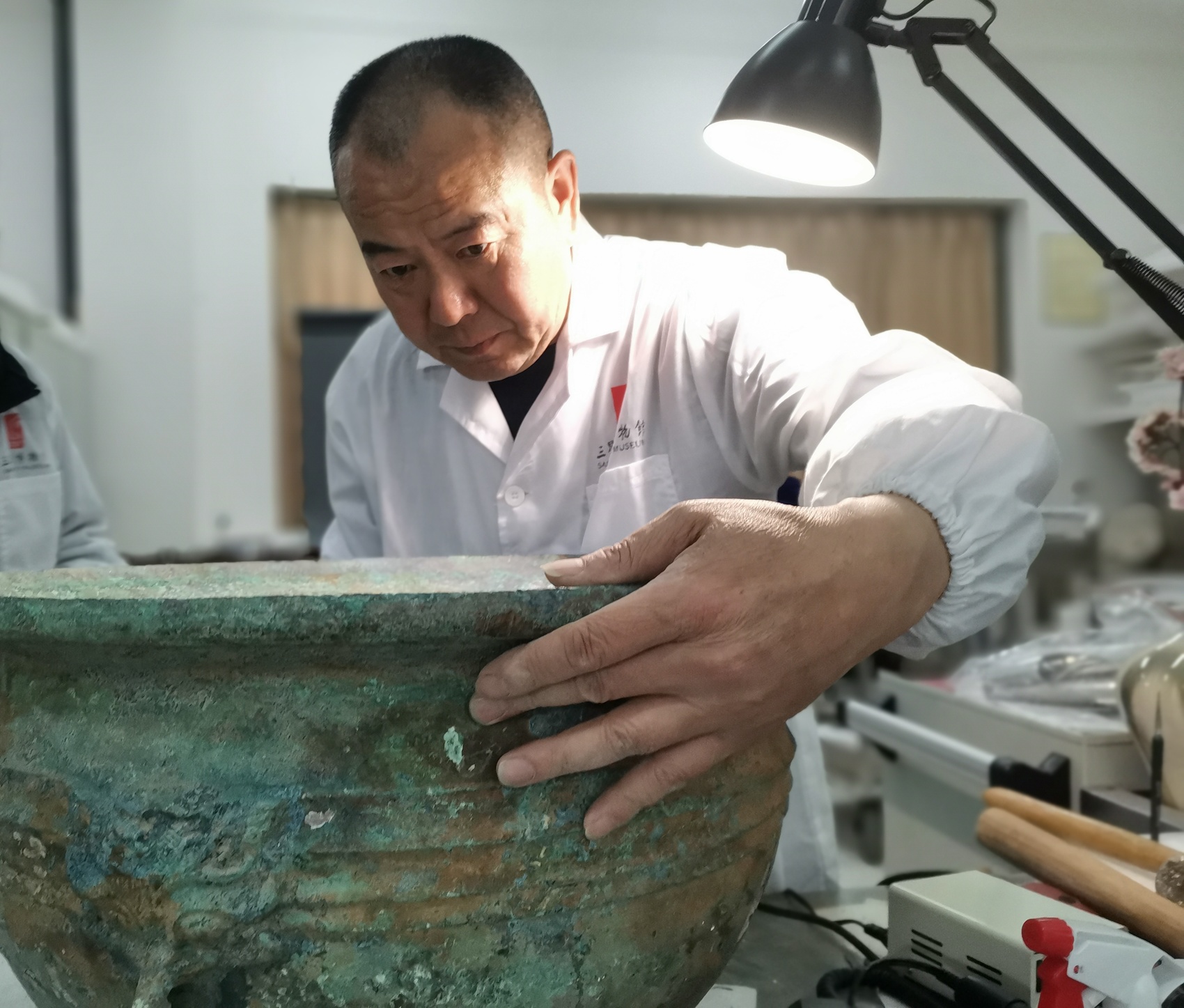 当第一缕阳光洒在三星堆博物馆的展厅,郭汉中总会提前来到工作室,穿上工作服,拿起工具,开始一天的工作。38年,他的双手磨出了厚茧,眼角添了皱纹,但当指尖触碰到文物的那一刻,眼神依旧像当年那个少年般炽热。“我要做一辈子文物的‘守护者’,让历史尘埃下的瑰宝持续闪耀。”郭汉中坚定地说。