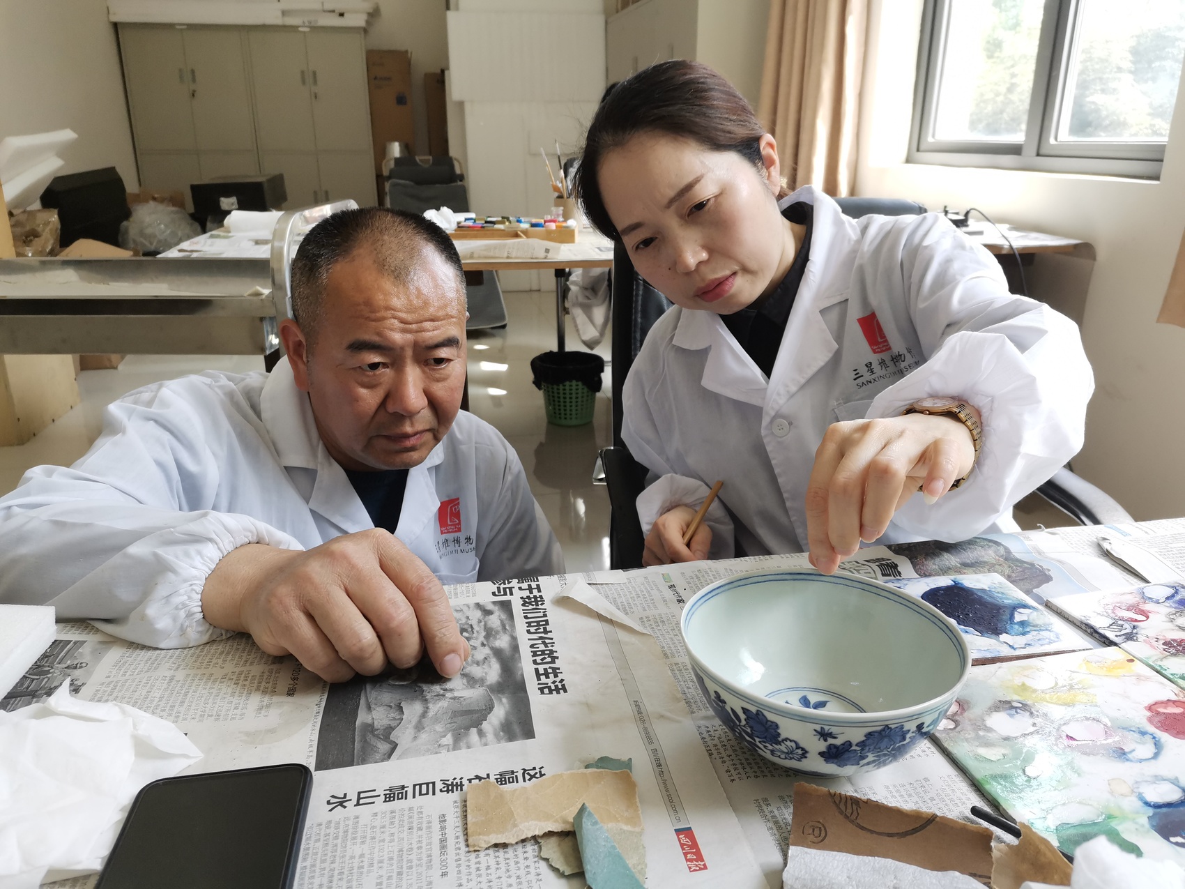 郭汉中指导徒弟王荔修复一只清代的陶瓷碗。(罗园 摄)