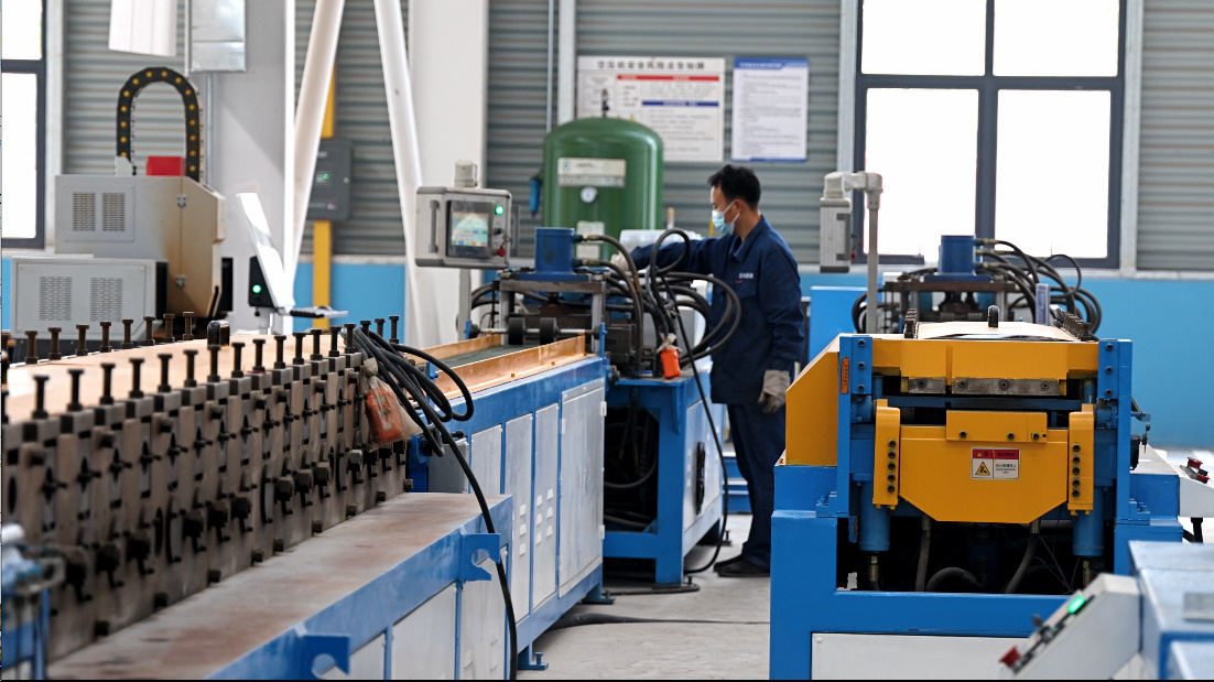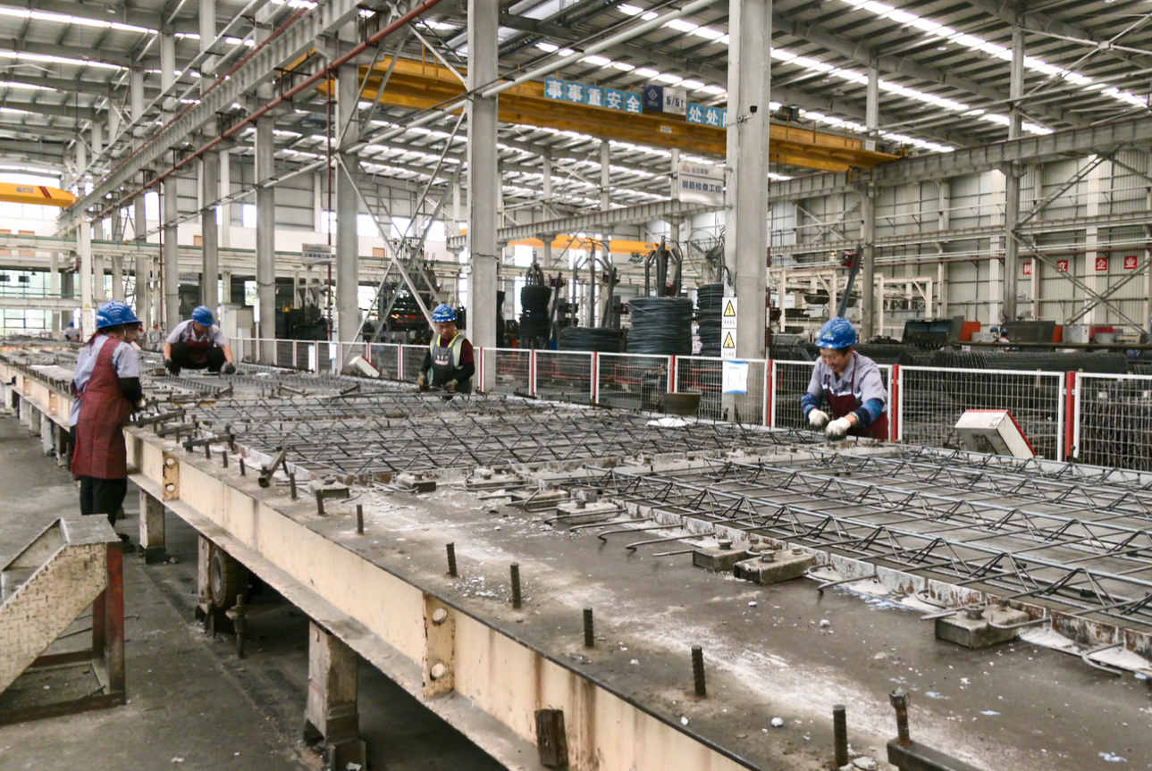 在位于四川仁寿经开区的四川山立建筑科技有限公司的生产车间内 ,工人正在绑扎钢筋。