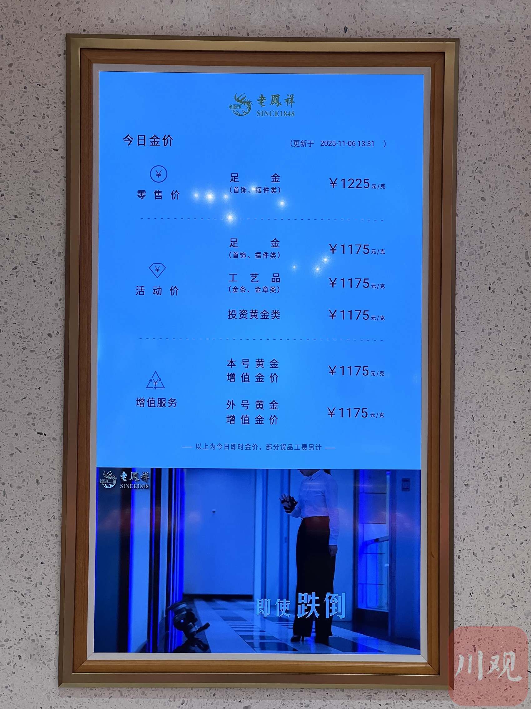 在老凤祥门店,记者看到其足金当天零售价格为1225元/克,足金、工艺品、投资黄金类产品活动价均为1175元/克,零售价格较10月29日上涨39元/克。周大福门店,当天的零售金价为1259元/克,较10月29日上涨73元/克。
